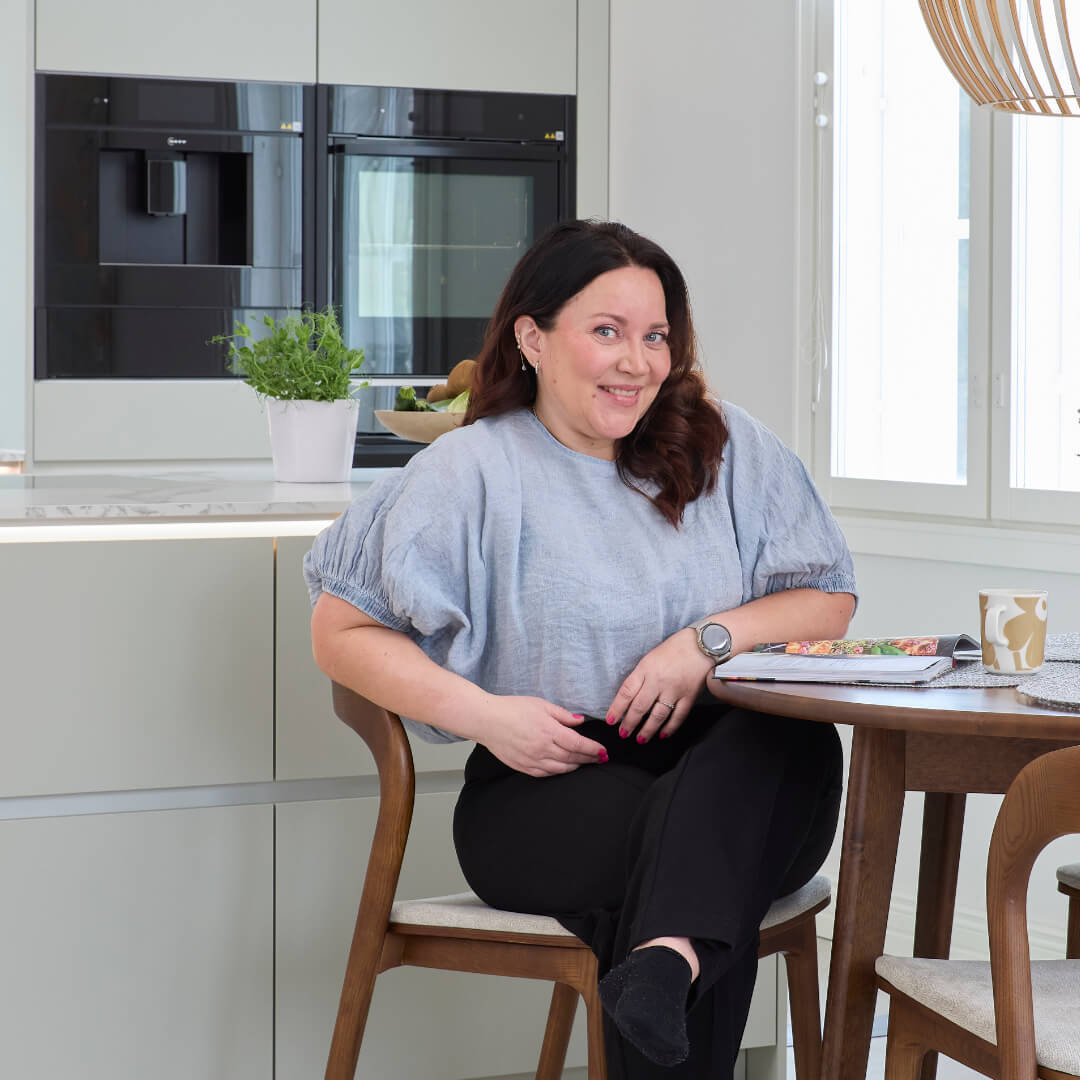 Omakotitalon Lappeenrannan lähistölle rakentanut Sonja Salla nauttii perheineen uudesta kodista, jossa pehmeä värimaailma ja monipuoliset säilytysratkaisut yhdistyvät toimivaksi kokonaisuudeksi. Sonjan suosikki on Noblessan mineraalinvihreä Divine-keittiö, ja tässä keittiössä riittääkin ihasteltavaa. Tilava saareke, apteekkarinkaappi ja aamiaiskaappi sekä saarekkeen vihertävä kvartsiittitaso ovat vain osa kodin kohokohdista: