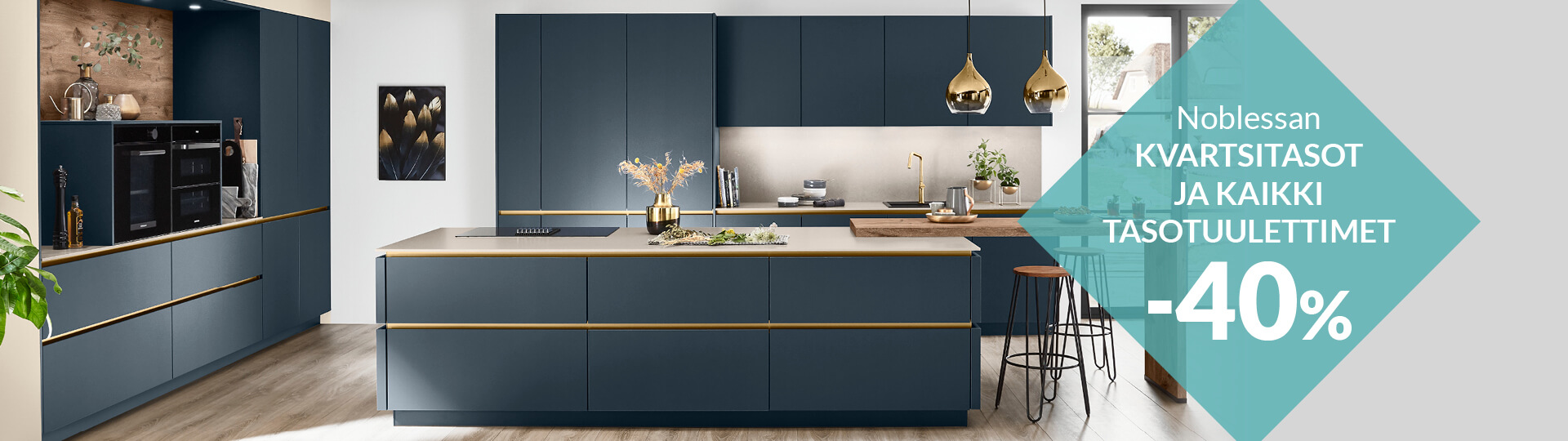 - Noblessan kvartsitasot ja kaikki tasoliesituulettimet –40 %, kun ostat vähintään 6000 euron keittiön. Alennus ei koske asennustyötä.