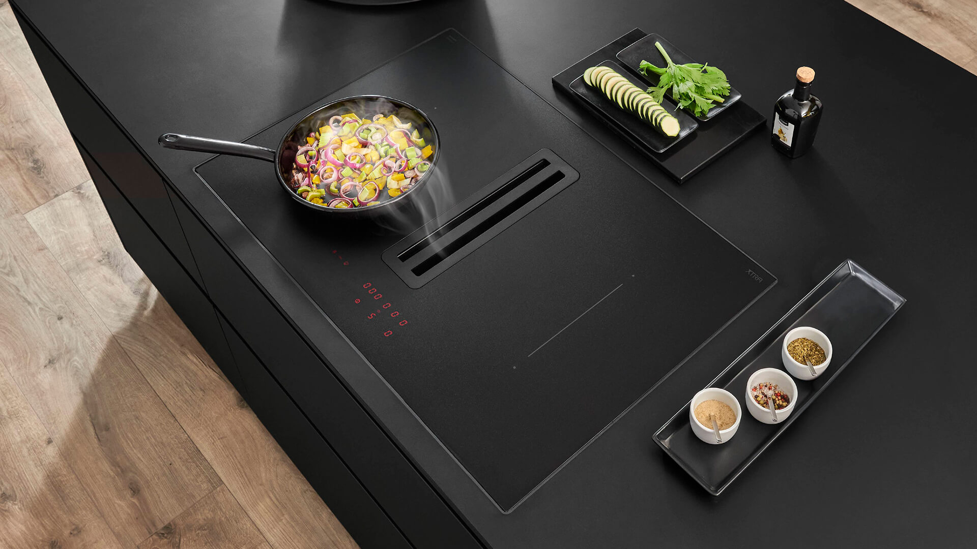 Moni valitsi keittiöönsä myös työtasoon integroitavan keittotasoliesituulettimen. Huomaamattomat tasoliesituulettimet pitävät näkymän keittiöön ja sieltä muihin tiloihin avoimena, ja laitteiden tehokas ilmanpoisto varmistaa raikkaan sisäilman kokkaillessa.