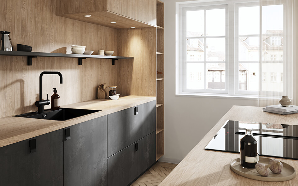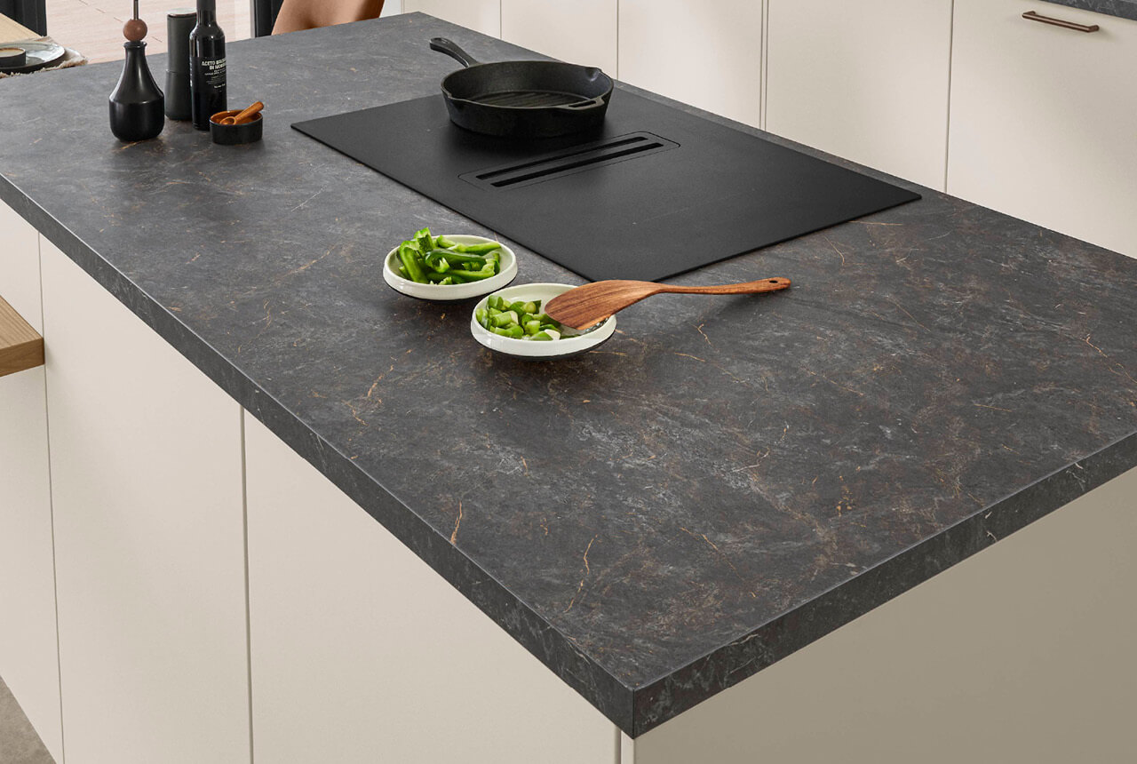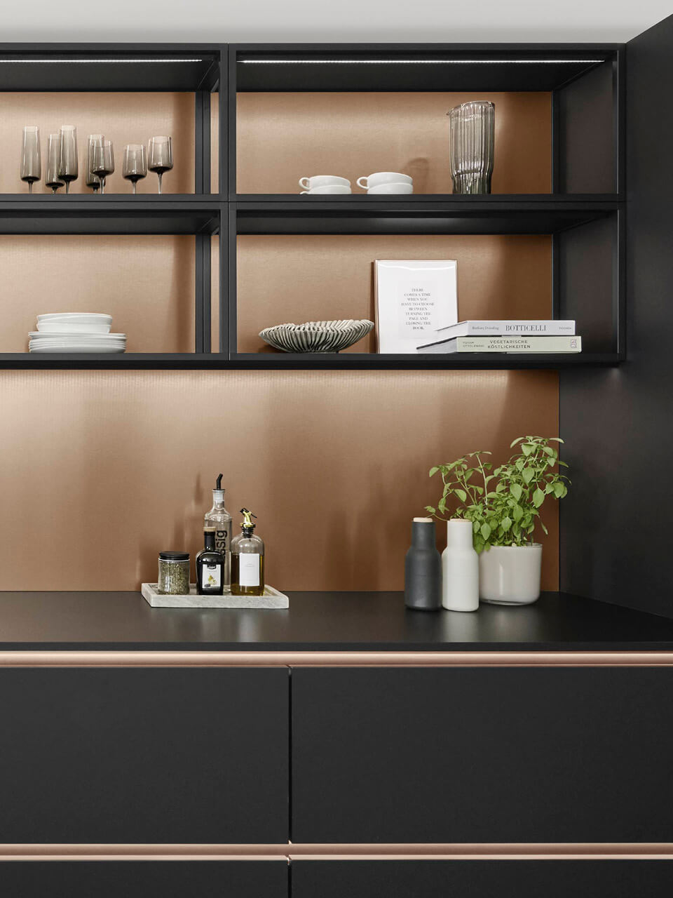 Yhdistä tummaan laminaattitasoon pronssinhohtoinen välitilapaneeli, niin saat keittiöön upeaa säihkettä! Kaappien ja hyllyjen alapintaan integroitu valaistus korostaa pronssin lämmintä hehkua ja tuo kauniin kontrastin tummaan työtasoon.