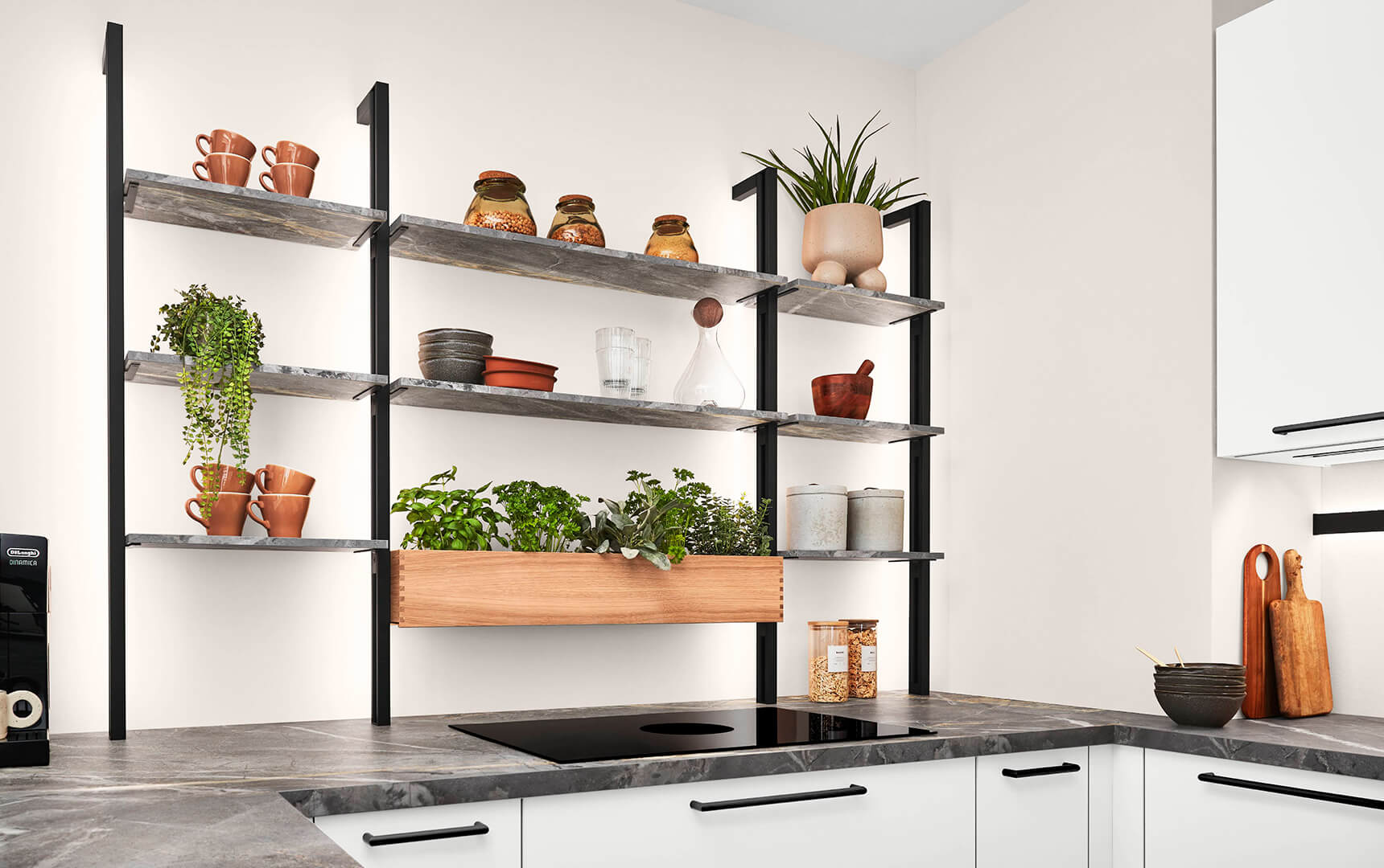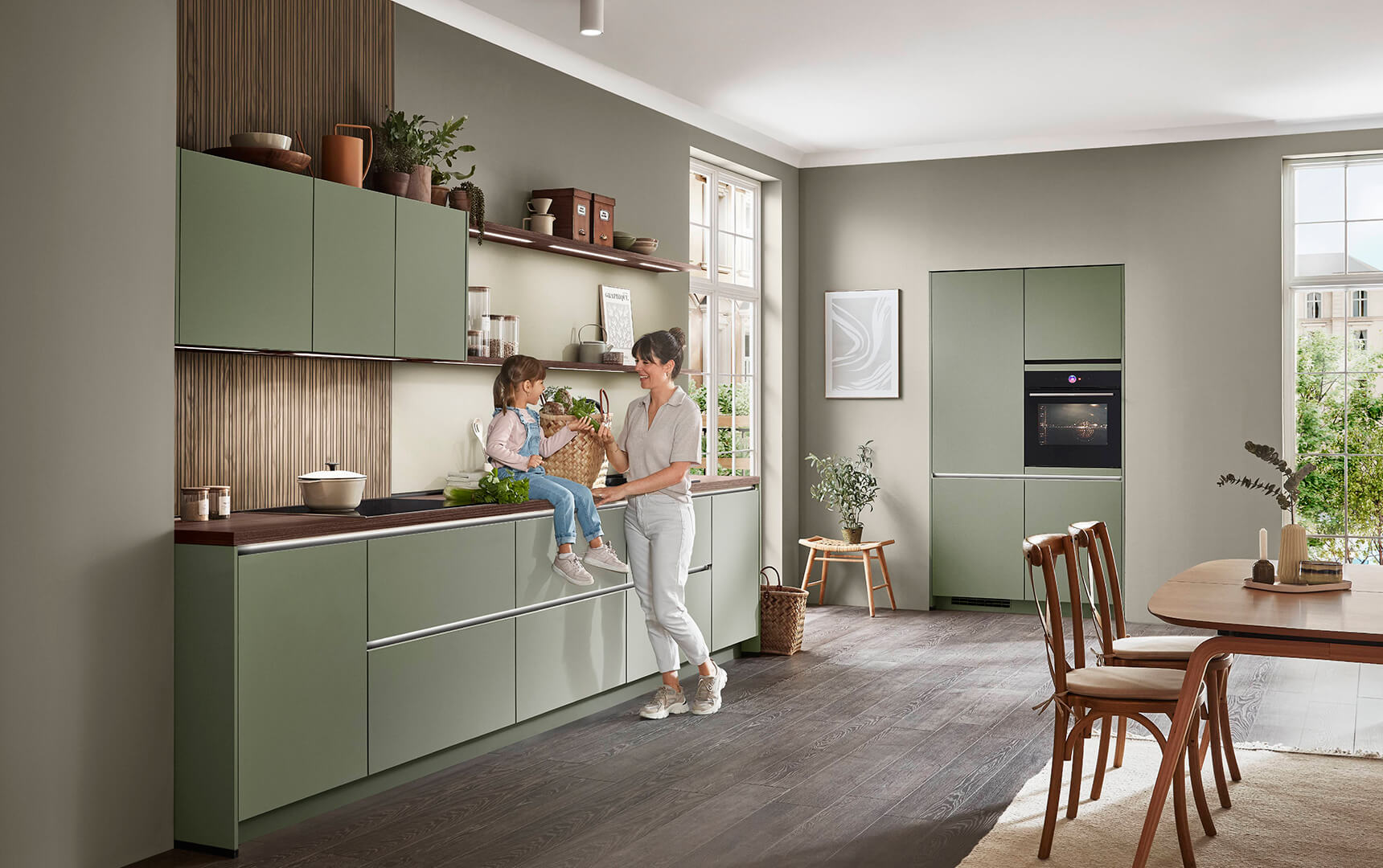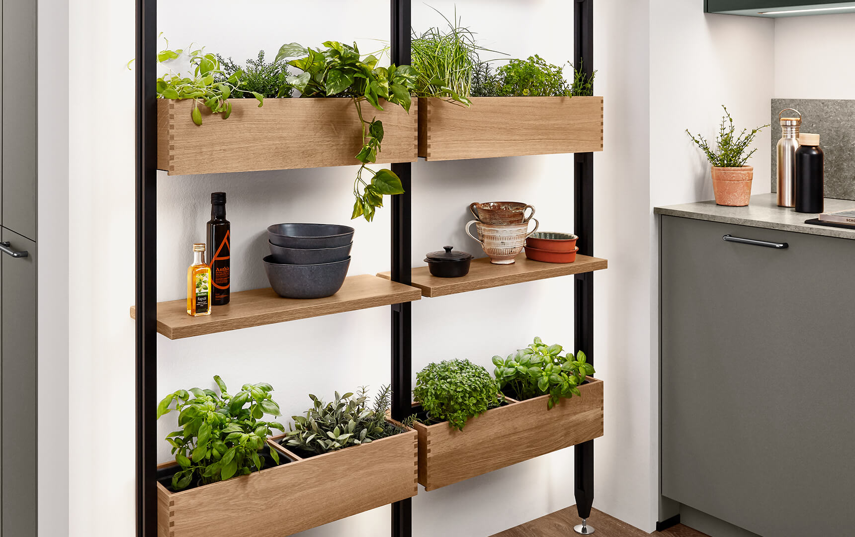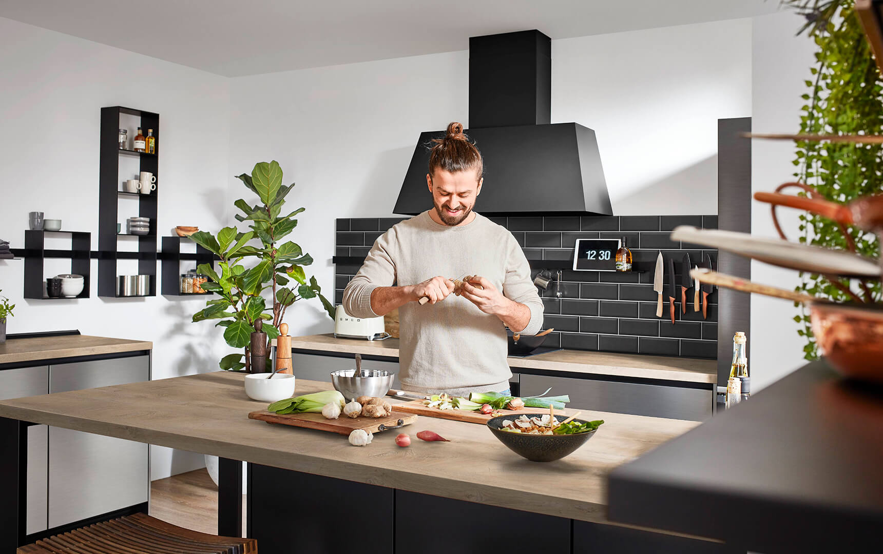 Kodikkaassa keittiössä käytetään myös luonnonläheisiä sävyjä ja materiaaleja, kuten pehmeitä ruskean sävyjä ja puukuoseja. Viherkasvit tuovat keittiöön viihtyisyyttä, ja niitä voi avohyllyjen lisäksi sijoittaa Noblessan erityisiin kasvihyllyihin, joissa on integroituna kasvua edistävät kasvivalot.