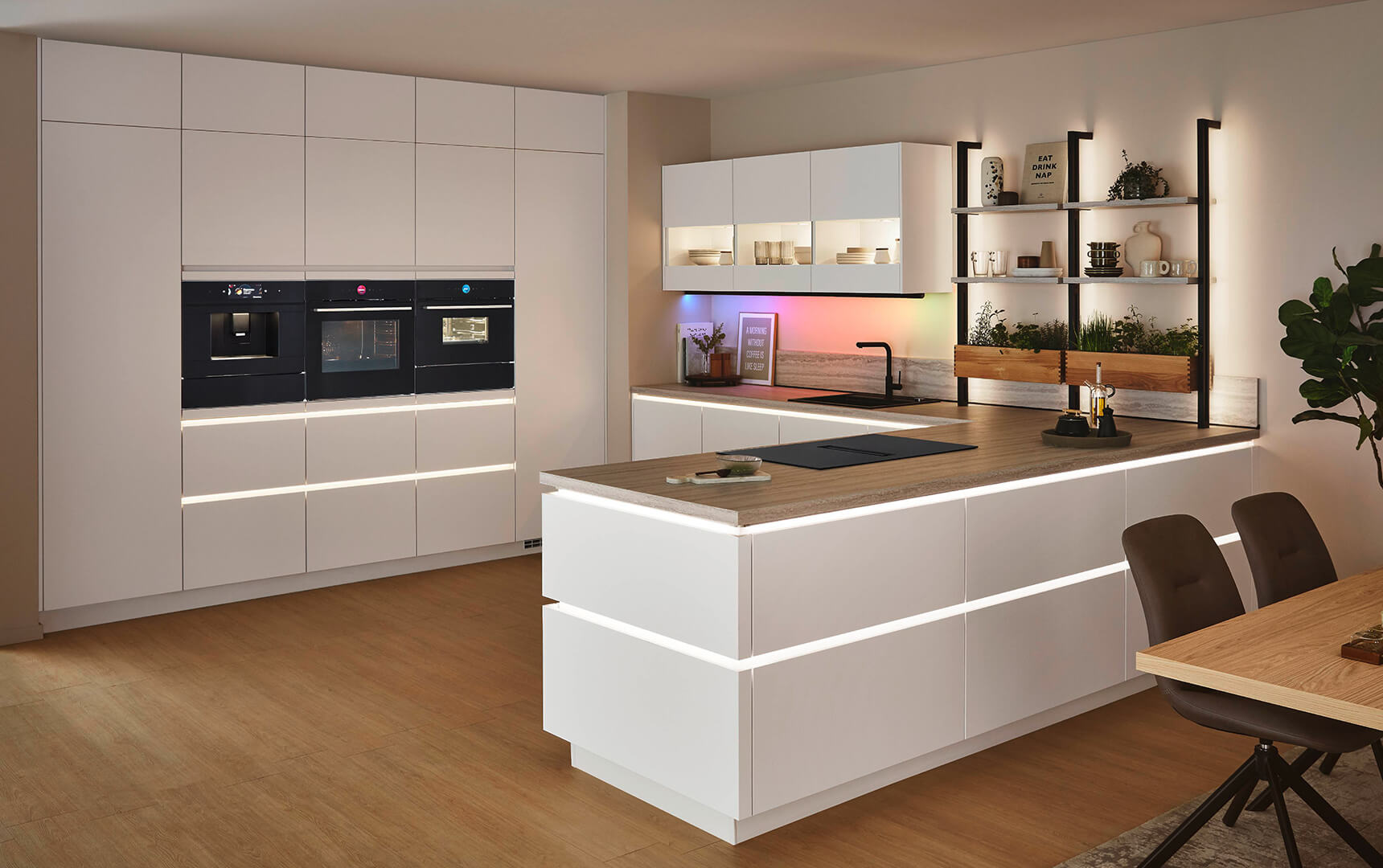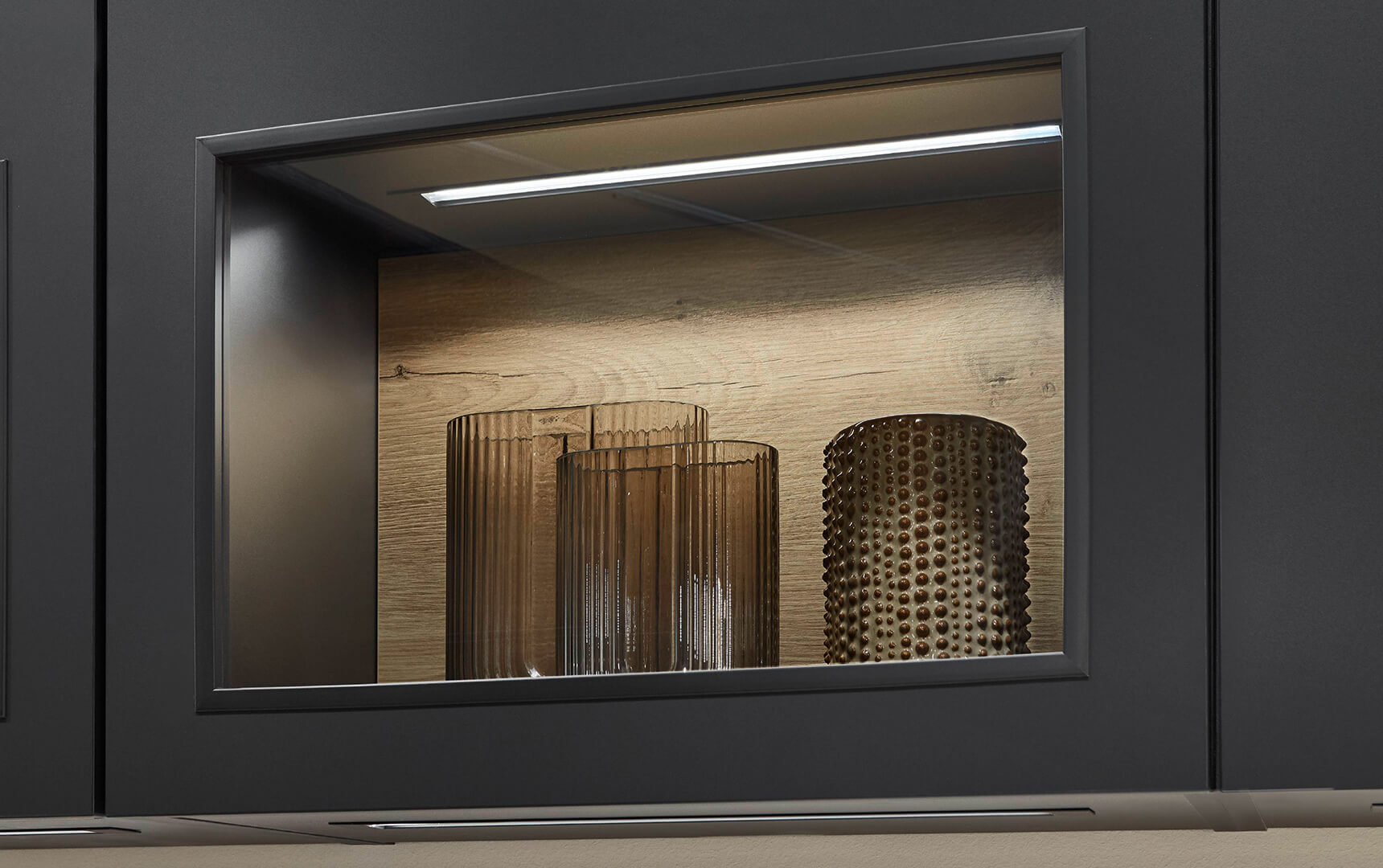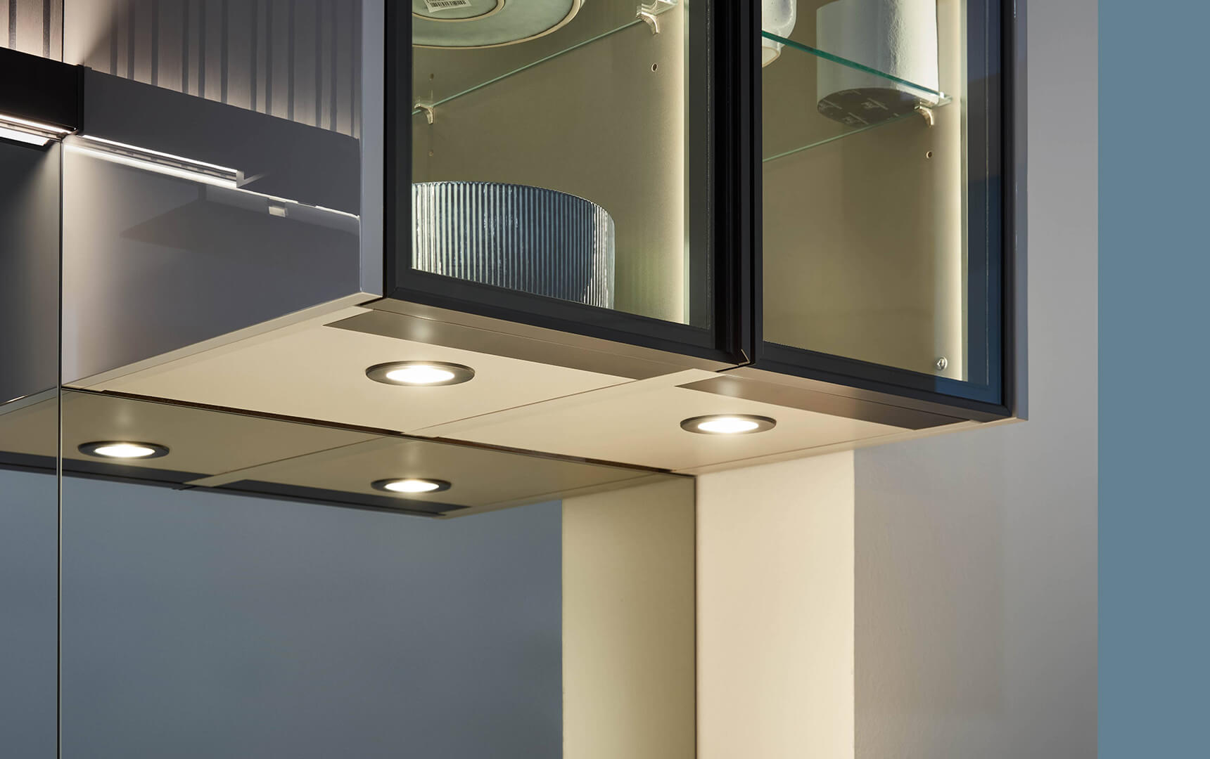 – Noblessan asiakkaat haluavat yleensä keittiöönsä jonkun jujun eli näyttävän yksityiskohdan. Sellaisen voi luoda valaistuksella. Esimerkiksi Line N -keittiön uravalo, lasiovikaappien sisävalot, erilaiset valohyllyt, sokkelivalot sekä kaapin päälle asennettu epäsuora valo tekevät keittiöstä upean. Uutuusmallistomme lasiovikaapit erinäisin taustapaneelein ja valoin ovat nyt IN!