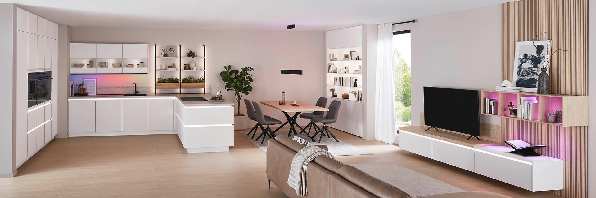 Valaistuksella on iso rooli keittiön tunnelmanluojana, ja monipuolisilla valonlähteillä keittiöön saa vaihtelua ja muunneltavuutta. Noblessan kaapistoihin integroitua valaistusta voi säätää kaukosäätimellä tai liittää sen osaksi älykodin muuta ohjausjärjestelmää. Valon kirkkauden lisäksi myös valaistuksen värilämpötilaa voi säätää lämpimämmäksi tai kirkkaammaksi.
