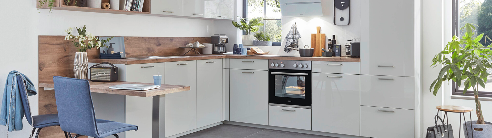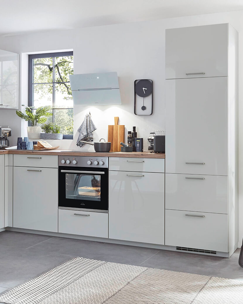 Harmaakin keittiö voi säihkyä, ainakin jos valitset kaapistoon Noblessan korkeakiiltoiset Esprit- tai Empire-ovet. Korkeakiiltoiset ovipinnat näyttävät sileän virheettömiltä - kunhan putsaat niitä säännöllisesti. Esprit-kaapiston kiiltäviä ovimalleja saa vaalean satiininharmaan tai tummemman liuskekivenharmaan sävyissä.