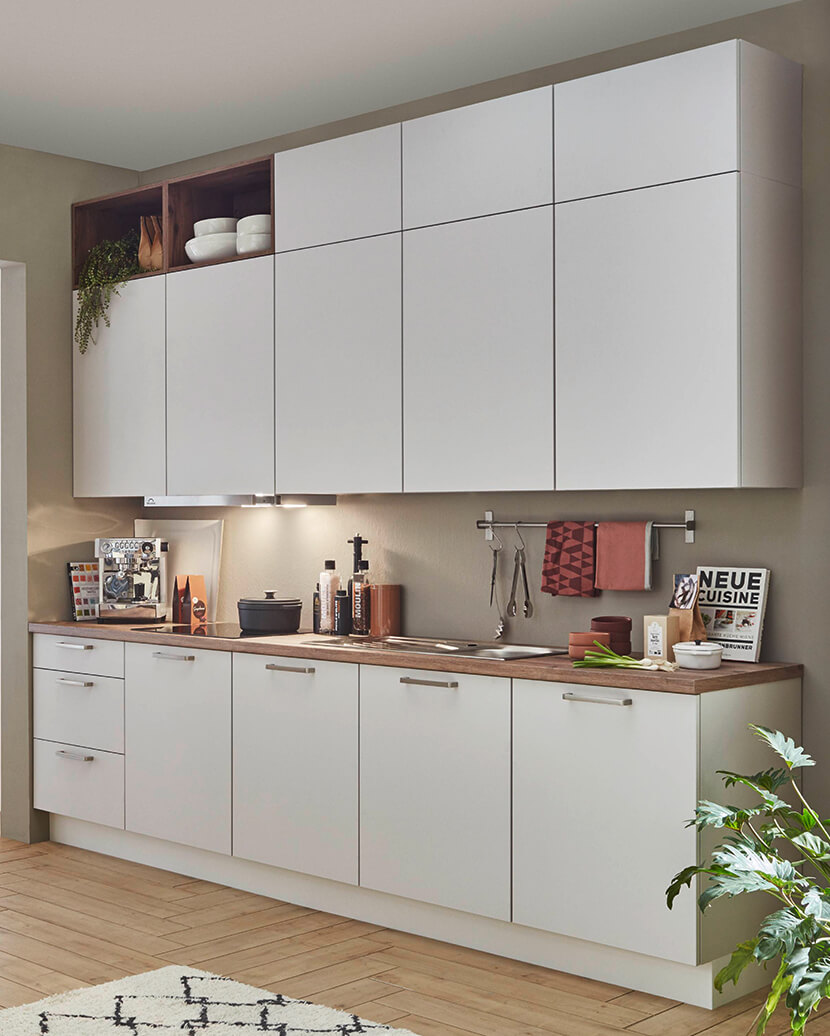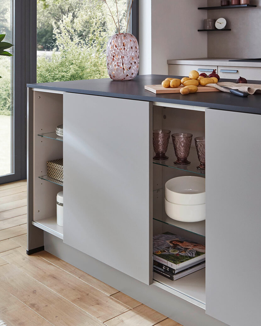 Serenity-ovimallissa on täydellisen sileäksi hiottu pinta ja sormenjälkiä hylkivä pinnoite. Nimensä mukaisesti tämä ovi on kuin tyyni järven pinta hillityssä eleettömyydessään ja kauniissa satiininharmaassa sävyssään. Kaapistoa saa sekä vetimettömänä että vetimellisenä mallina. Vetimettömän Line N -keittiön hillitty charmi puree aina, mutta kahvalliseen keittiöön saa enemmän persoonallista ilmettä esimerkiksi mustilla tankovetimillä.
