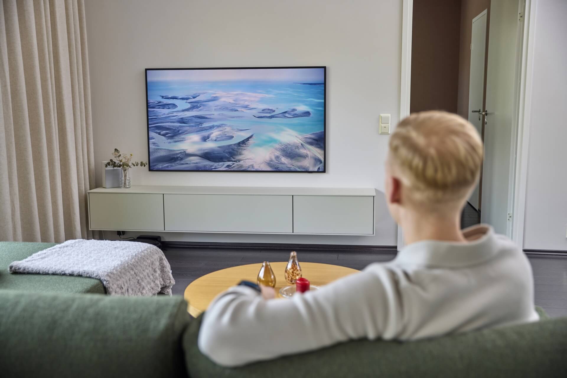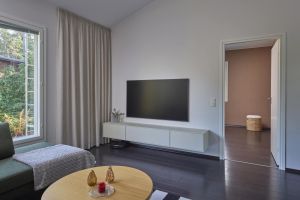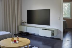 Kiintokalusteiden yhtenäinen linja jatkuu nyt myös olohuoneeseen toteuttamassamme tv-tasossa Noblessan uusilla push to open -laatikoilla. Kalusteen erikoisuutena on 10 mm paksut, koko kalusteen kehystävät levyt, sekä siivousta helpottava seinäkiinnitys. Tv-tason sävyksi valitsimme Noblessan Divine-malliston hiekan sävyn, jota harkitsimme aluksi myös keittiön ovien väriksi.
