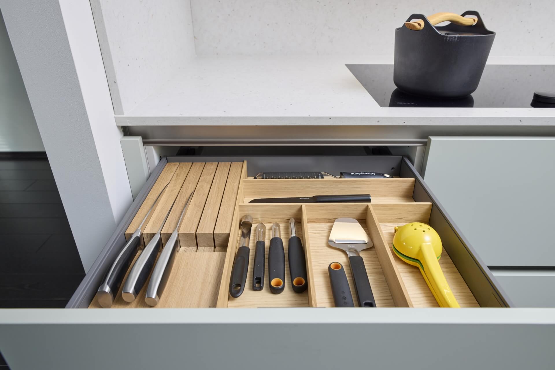 Uuni ja mikro asennettiin komeroon ergonomiselle korkeudelle, jotta laitteiden sisälle näkee helposti. Mikron yläpuoleiseen kaappiin tehtiin kapeat hyllyvälit peltejä ja leikkuulautoja varten, jolloin ne ovat helposti saatavilla ja eivät vie tilaa laatikostoista.