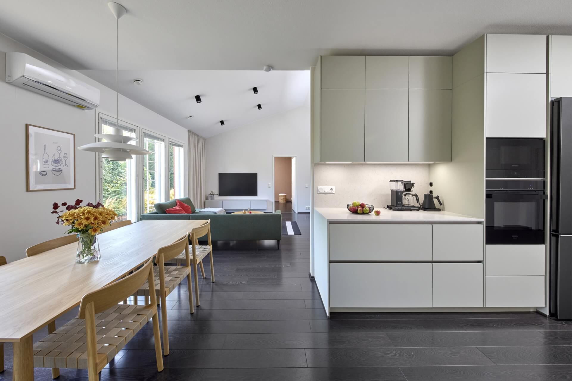 Harkittu tyyli jatkuu keittiöstä olohuoneeseen