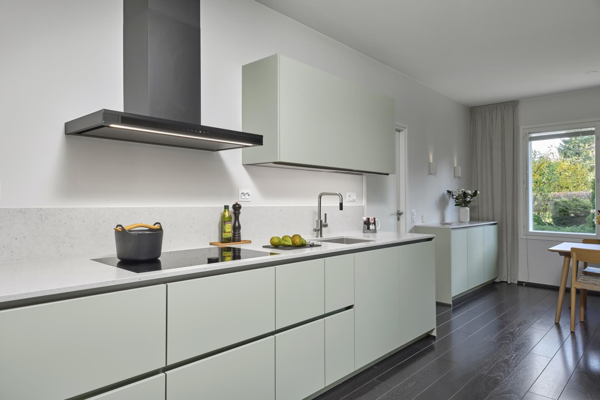 Ensimmäiseksi mietimme, minkälaisen värimaailman haluamme uuteen kotiimme, ja minkä tyylinen keittiö sopisi kokonaisuuteen. Jaden sävyinen kaapisto sointui lopulta parhaiten muiden pintojen värimaailmaan ja täydensi kotimme väripaletin. Vaaleanvihreässä Sentido-keittiössä on kaunis mattapinta ja sormenjälkiä hylkivä pinnoite, mikä miellytti meitä molempia.