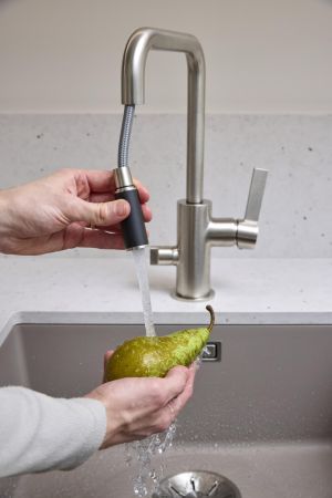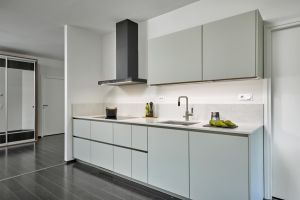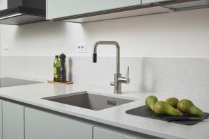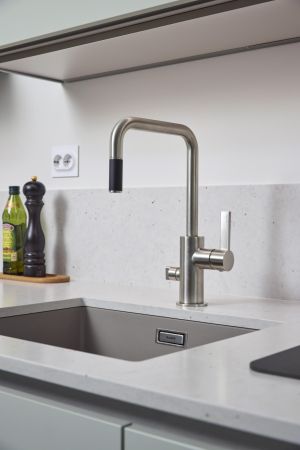 Valitsimme Noblessan keittiömallistosta vetimettömän Line N -keittiön, joka on muotoilultaan sopivan pelkistetty. Ovipinnat ovat helposti pyyhittävissä, kun ovissa ei ole ylimääräisiä välejä. Vetimien urat toivat keittiöön hienovaraista tehosteväriä, joka toistuu tyylikkäästi myös Tapwellin hanassa luoden yhtenäisen ilmeen.