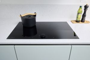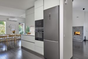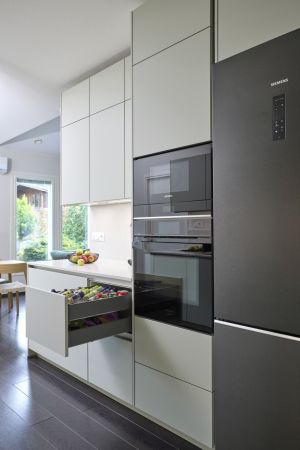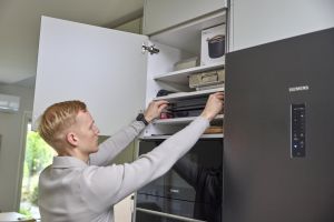 Kodinkoneiden valinnassa satsasimme moderniin teknologiaan. Meille oli tärkeää uunin höyryavustus ja pyrolyysitoiminto, mikron inverter-tekniikka, 80 cm leveä liesi mekaanisella säätimellä sekä Siemensin Zeolith-kuivaustekniikalla varustettu astianpesukone. Valitsimme Siemensin mallistosta uunin, mikron, astianpesukoneen ja 70 cm leveän kylmälaitteen. Liesituuletin on Elican tehokas ja hiljainen 90 cm leveä malli, ja sen pariksi tuli Neffin liesi. Lieden ohjaamiseen käytettävä magneettinuppi on ollut yksi suosikkitoiminnoistani. Se tekee käytöstä nopeaa ja vaivatonta.