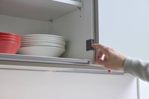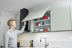 Hyödynsimme sähköisiä avausmekanismeja myös astianpesukoneessa sekä 90 cm leveässä, ylöspäin aukeavassa yläkaapissa altaan yläpuolella. Ylös aukeava ovi on siitä mukava, että kun tyhjennämme astianpesukonetta tai laitamme ruokaa, niin ovi voi olla hyvin auki koko tämän ajan, eikä ole tiellä.