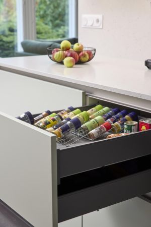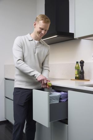 Jätelajittelu on meille arkea ja siihen halusimme panostaa. Altaan alle sijoitettiin tilavat ja syvät jäteastiat esimerkiksi muovien lajittelulle, ja altaan ja lieden väliin tasokorkeudelle sijoitettiin omat astiat bio- ja energiajätteelle. Näin roskien lajittelu onnistuu sujuvasti, vaikka toinen olisi altaalla. Altaan alapuoliseen jätevaunuun lisättiin sähköinen avausmekanismi, joka mahdollistaa oven avaamisen jalan heilautuksella.