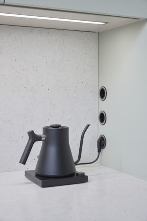 Kun myös komeroita tuotiin hieman ulospäin, pystyimme sijoittamaan Noblessan One -pistorasiat uunin taakse päätysivuun. Nyt kahvin- ja vedenkeittimen johdot eivät roiku kaapin alareunasta. Pistorasioita lisättiin keittiössä useisiin kohtiin, sillä niiden jälkiasennus on työlästä.