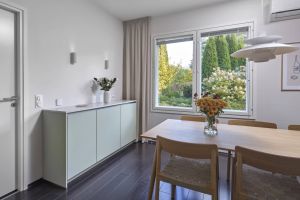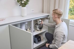 Aamiaiskaappia emme keittiöön kaivanneet, mutta halusimme pienlaitteille selkeän paikan, josta ne saa helposti esille ja käyttöön kun niitä tarvitaan. Siksi lisäsimme ruokapöydän päätyyn kapean senkin, jota voidaan hyödyntää monella tapaa. Tason päälle voi asetella tarjoiluastiat kattauksessa, ja pienlaitteet voi nostaa suoraan kaapista tasolle.