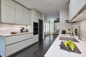 Keittiön asensimme itse, mutta kokemuksesta suosittelen lämpimästi ammattitaitoista kalusteasentajaa, jos haluaa projektin sujuvan tehokkaasti. Mitä enemmän keittiöön haluaa erikoisratkaisuja, kuten kalusteiden tuomista eteenpäin molemmilla seinillä, vaativat nämä paljon lisätyötä erityisesti komeroiden kohdalla. Myös lieden takana näkyvä seinä piti tasoittaa huolellisesti, mikä vei paljon aikaa.