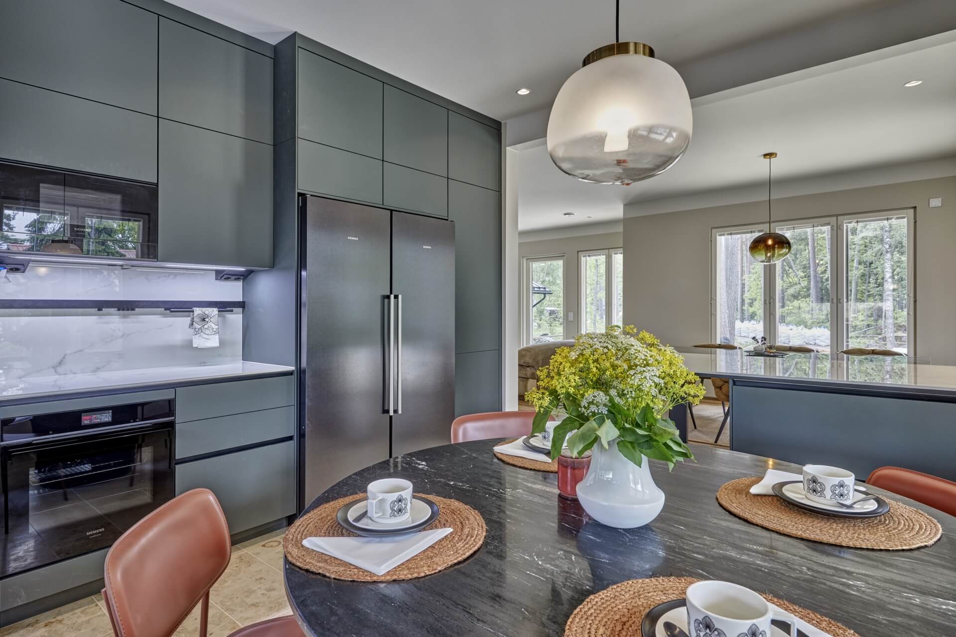 Keittiöön valittiin Noblessan vetimetön Divine-kaapisto ja reilusti säilytystilaa tuova XL-runkokorkeus. Rakennuttajapariskunnan toiveissa oli saada pieni ruokapöytä mahtumaan niemekekeittiöön, ja se toive toteutui suunnittelutapaamisessa Mona Lönnrothin kanssa Porvoon Noblessa-myymälässä: