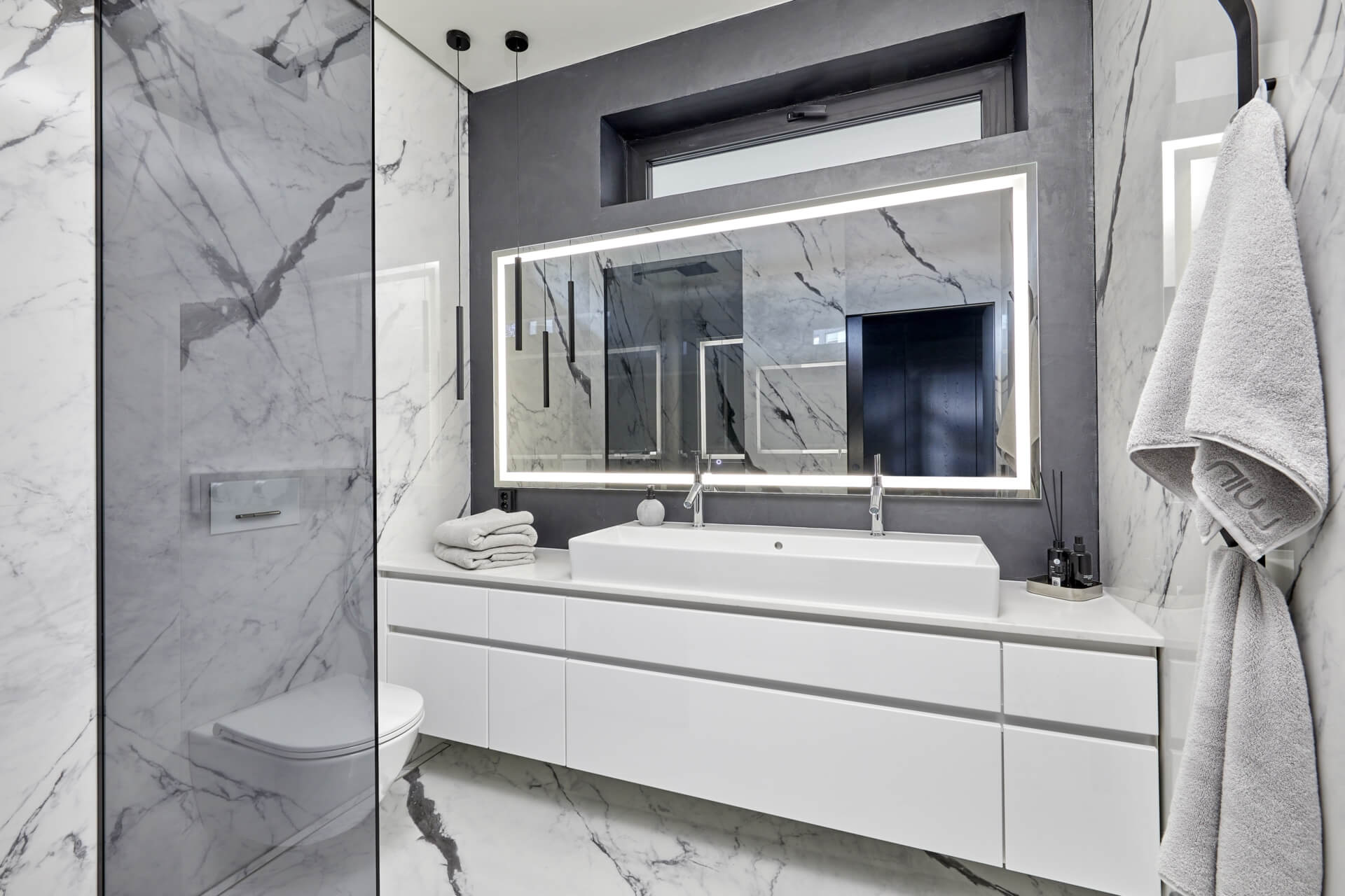 Noblessan kalusteilla sisustettiin keittiön lisäksi Villa Havetin eteinen, wc-tilat, olohuone ja kodinhoitohuone. Kodinhoitohuoneessa korkeat kaapistot pitävät arjen järjestyksessä. Vetimetön ja valkoinen Motion-kaapisto tuo tilaan raikkautta ja skandinaavista tyylikkyyttä. Wc-tiloissa kiiltävän valkoinen Passion-allaskaappi sopii linjakkaalla muotoilullaan näyttävien marmorilaattojen keskelle.