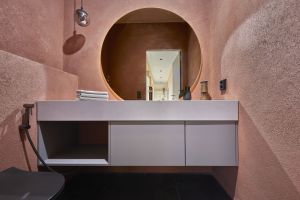 Keittiön lisäksi Noblessan kalusteilla sisustettiin myös talon kodinhoitohuone ja wc-tilat. Kodinhoitohuoneessa on Noblessan taupe-harmaa Divine-kaapisto sormenjälkiä hylkivällä pinnoitteella. Myös kodinhoitohuoneessa on vitriinikaappi ja yläkaappien alle integroidut led-valot, jotka valaisevat alapuolella olevaa työtasoa.