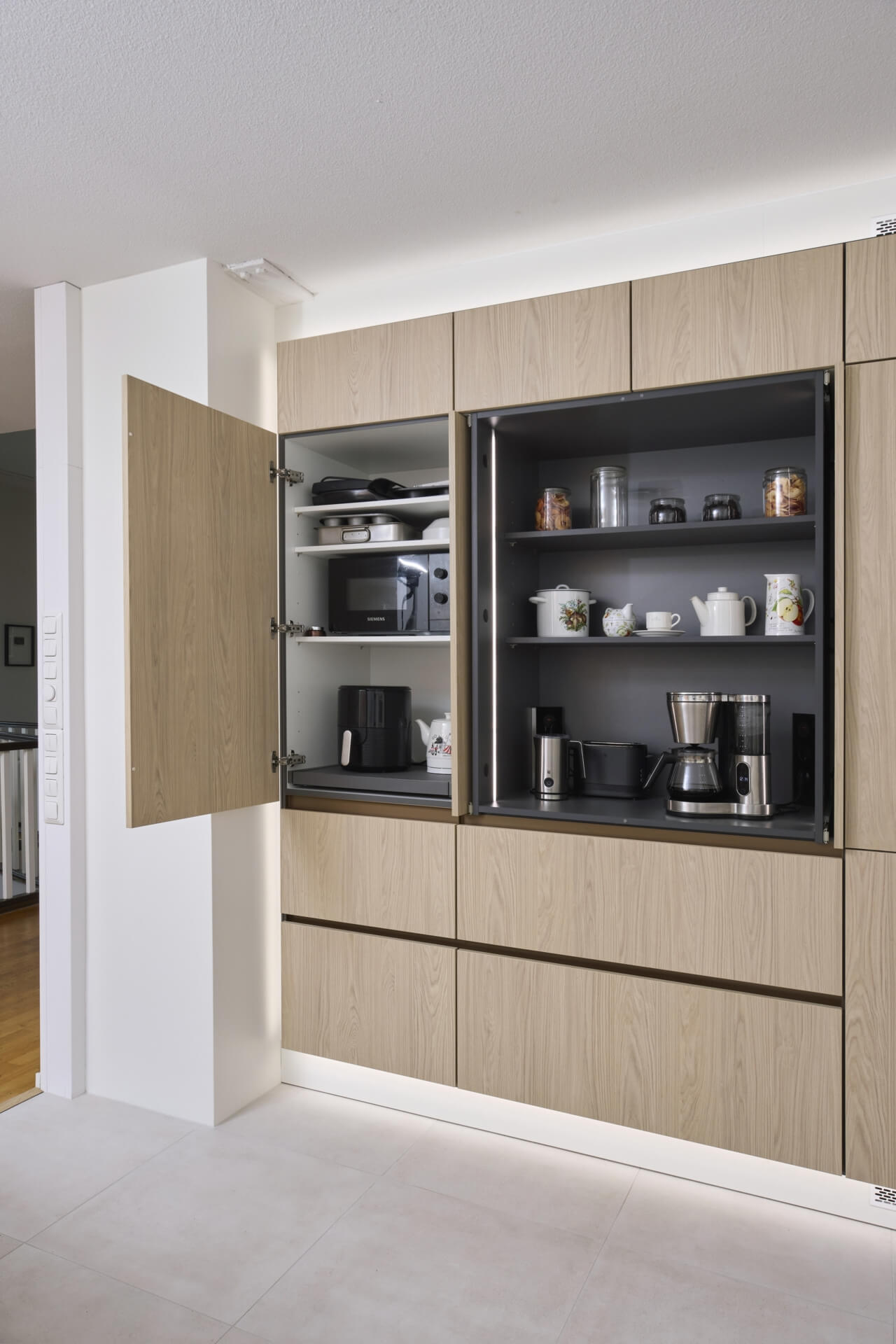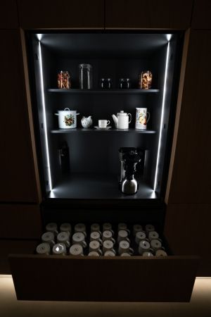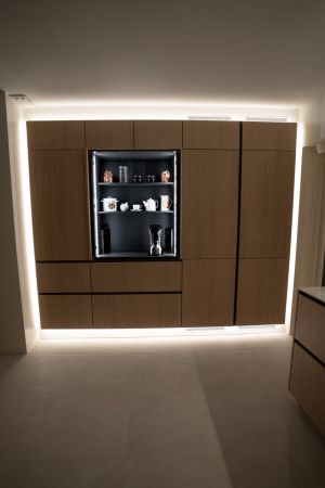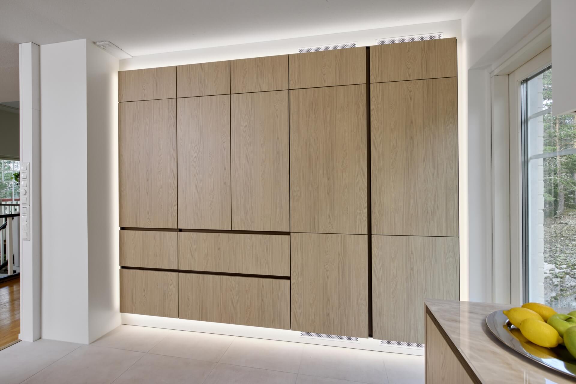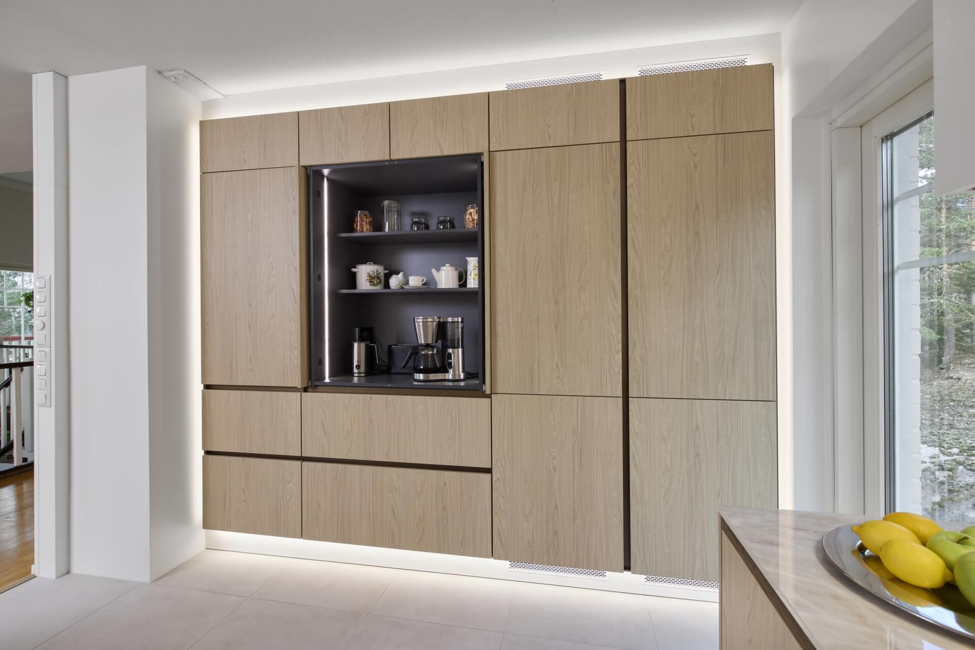 Tuomaksen ideoima, valaistu kaappiseinä tuntuu leijuvan ilmassa sitä kiertävän led-valaistuksen ansiosta. Etenkin hämärässä valot luovat kaapistolle näyttävät raamit ja korostavat sen modernia ilmettä. Jos kaapistoon haluaa vielä lisää näyttävyyttä, voi avata jommankumman kahdesta kaappiseinän aamiaiskaapista. Isompi ja valaistu aamiaiskaappi avautuu sisään liukuvalla pocket door –mekanismilla, ja toisessa aamiaiskaapissa on esiin vedettävä hylly, mistä esimerkiksi airfryer on helppo ottaa käyttöön: