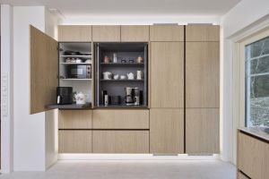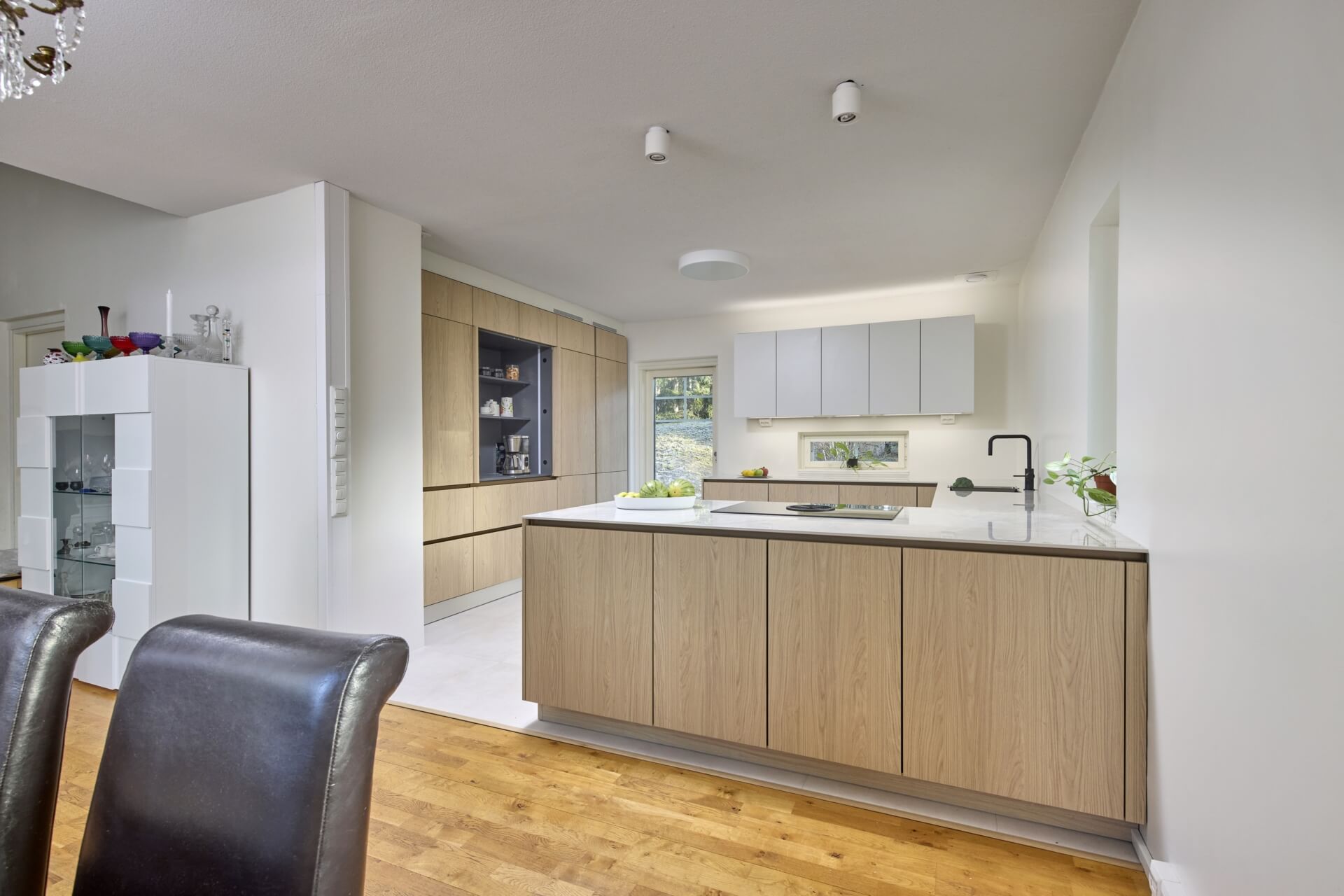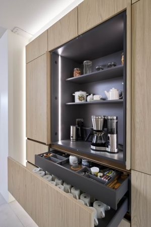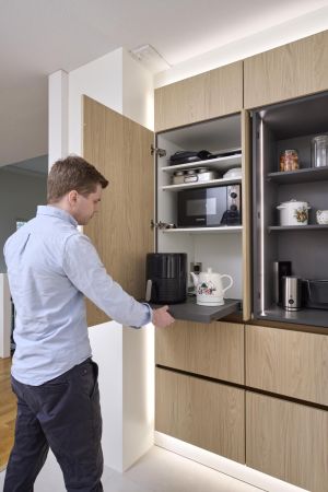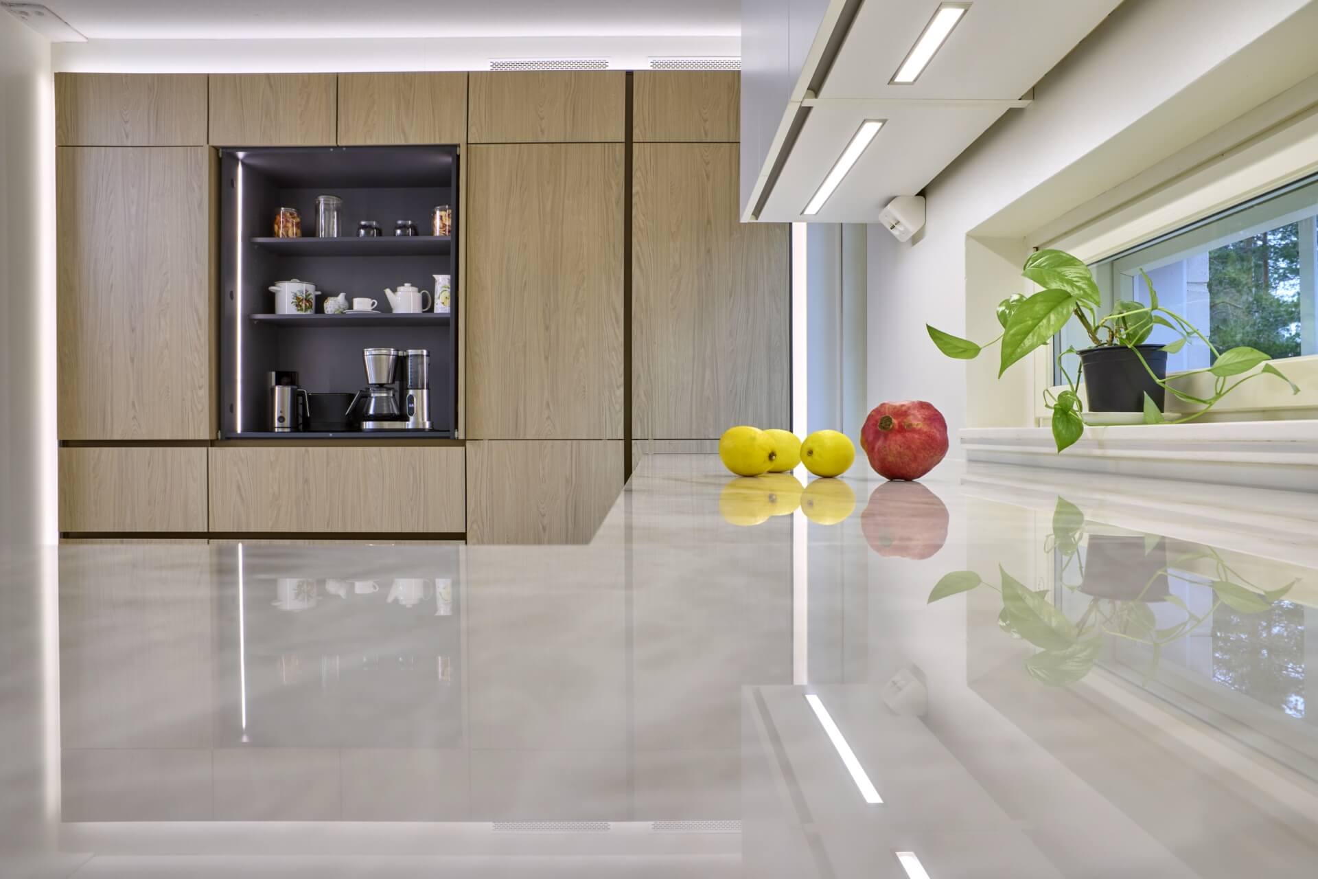 Tuomaksen ideoima, valaistu kaappiseinä tuntuu leijuvan ilmassa sitä kiertävän led-valaistuksen ansiosta. Etenkin hämärässä valot luovat kaapistolle näyttävät raamit ja korostavat sen modernia ilmettä. Jos kaapistoon haluaa vielä lisää näyttävyyttä, voi avata jommankumman kahdesta kaappiseinän aamiaiskaapista. Isompi ja valaistu aamiaiskaappi avautuu sisään liukuvalla pocket door –mekanismilla, ja toisessa aamiaiskaapissa on esiin vedettävä hylly, mistä esimerkiksi airfryer on helppo ottaa käyttöön: