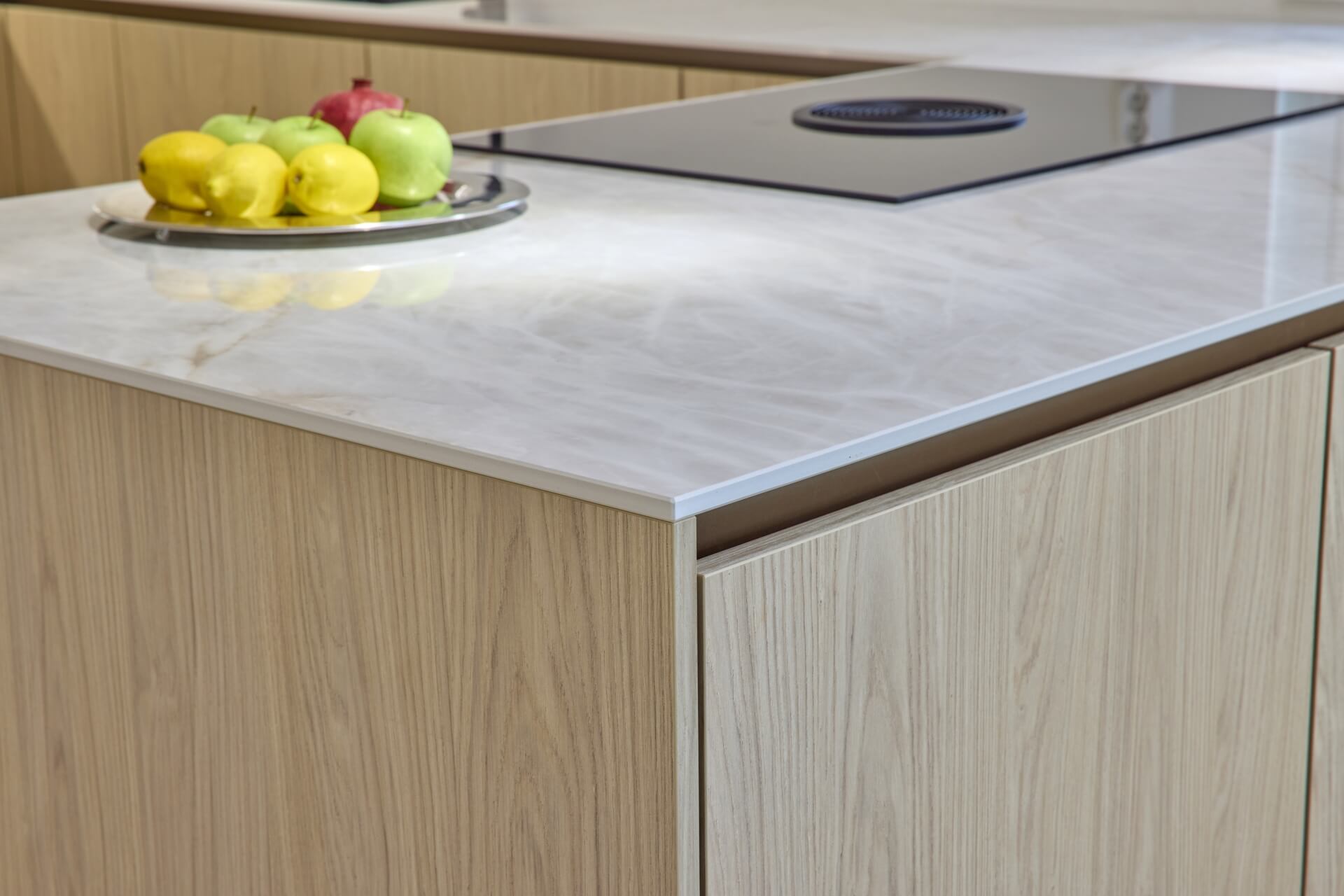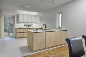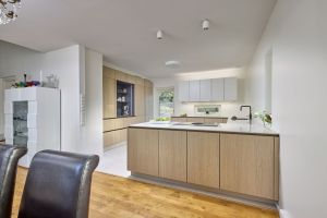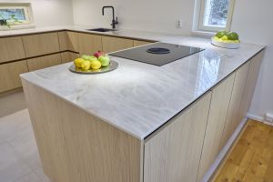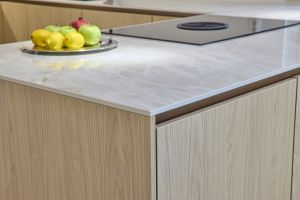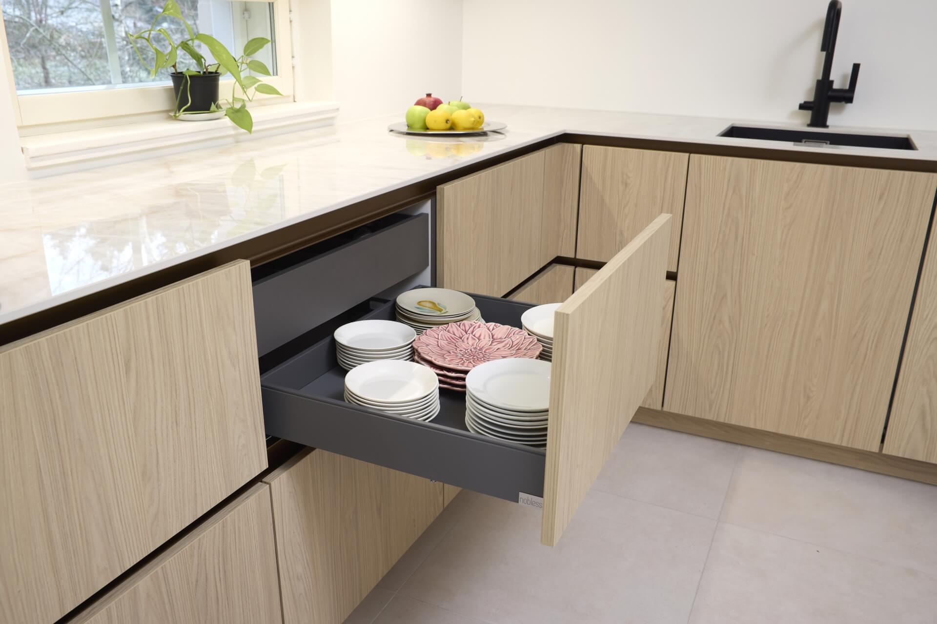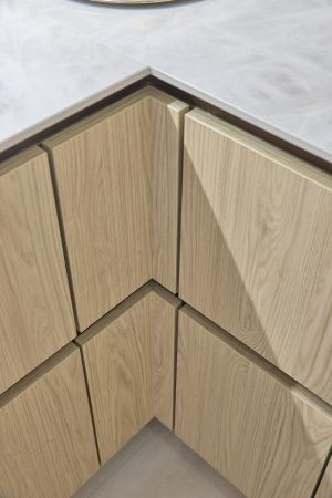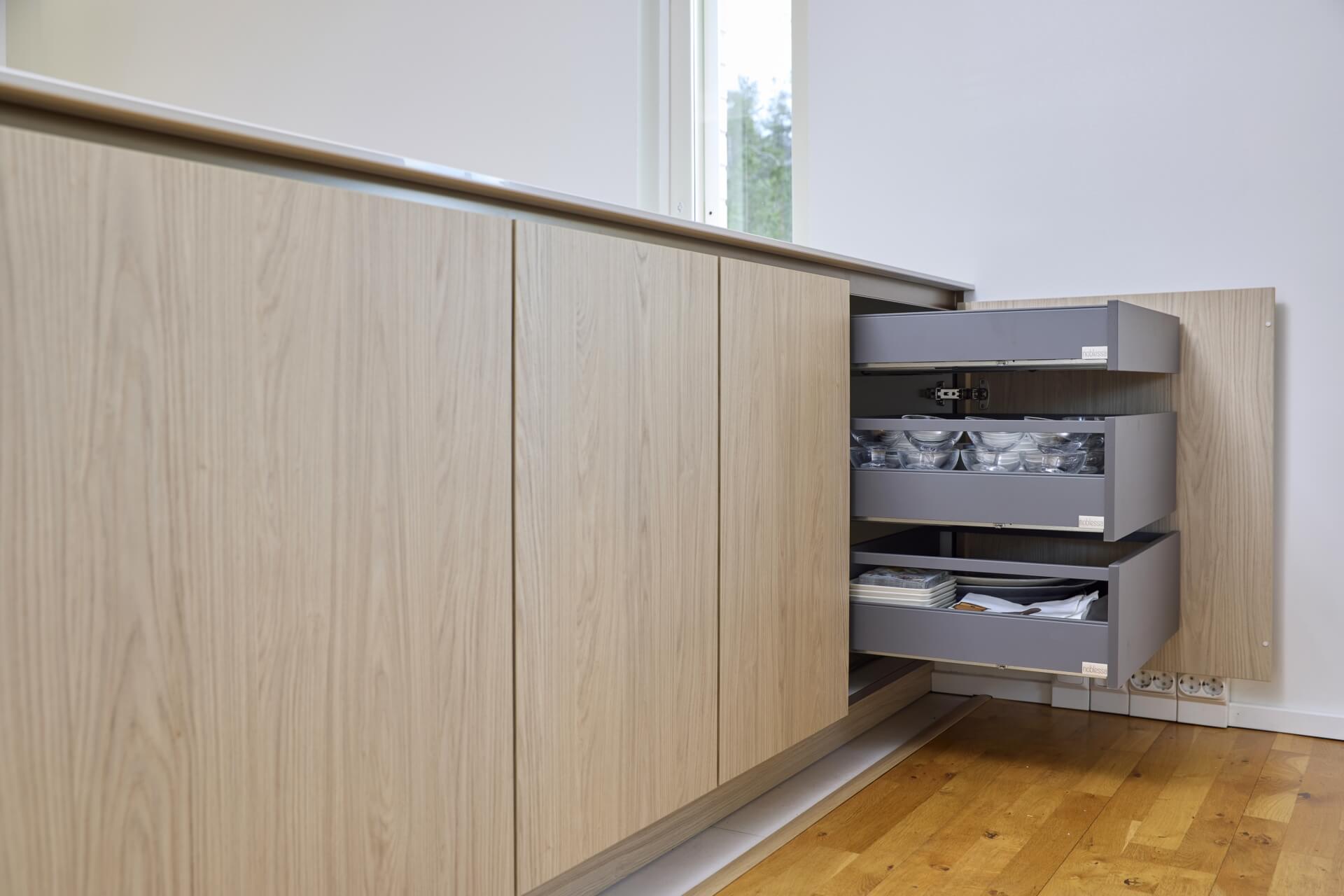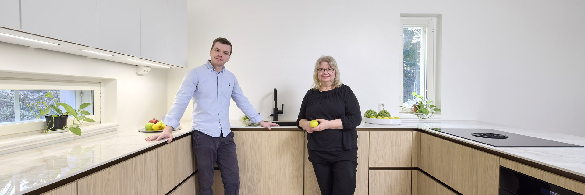 Äidin, pojan ja tyttären yhteinen keittiöremontti pääsi vauhtiin, kun he vierailivat Noblessan Turun-myymälässä. Kauppias Ari Soiniitty tarttui projektiin ja alkoi ideoida toteutusta Tuomaksen kattavan taustatyön pohjalta. Uudeksi keittiöksi valittiin Noblessan vetimetön Line N -keittiö tyylikkään vaalealla tammikuosilla.
