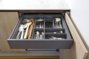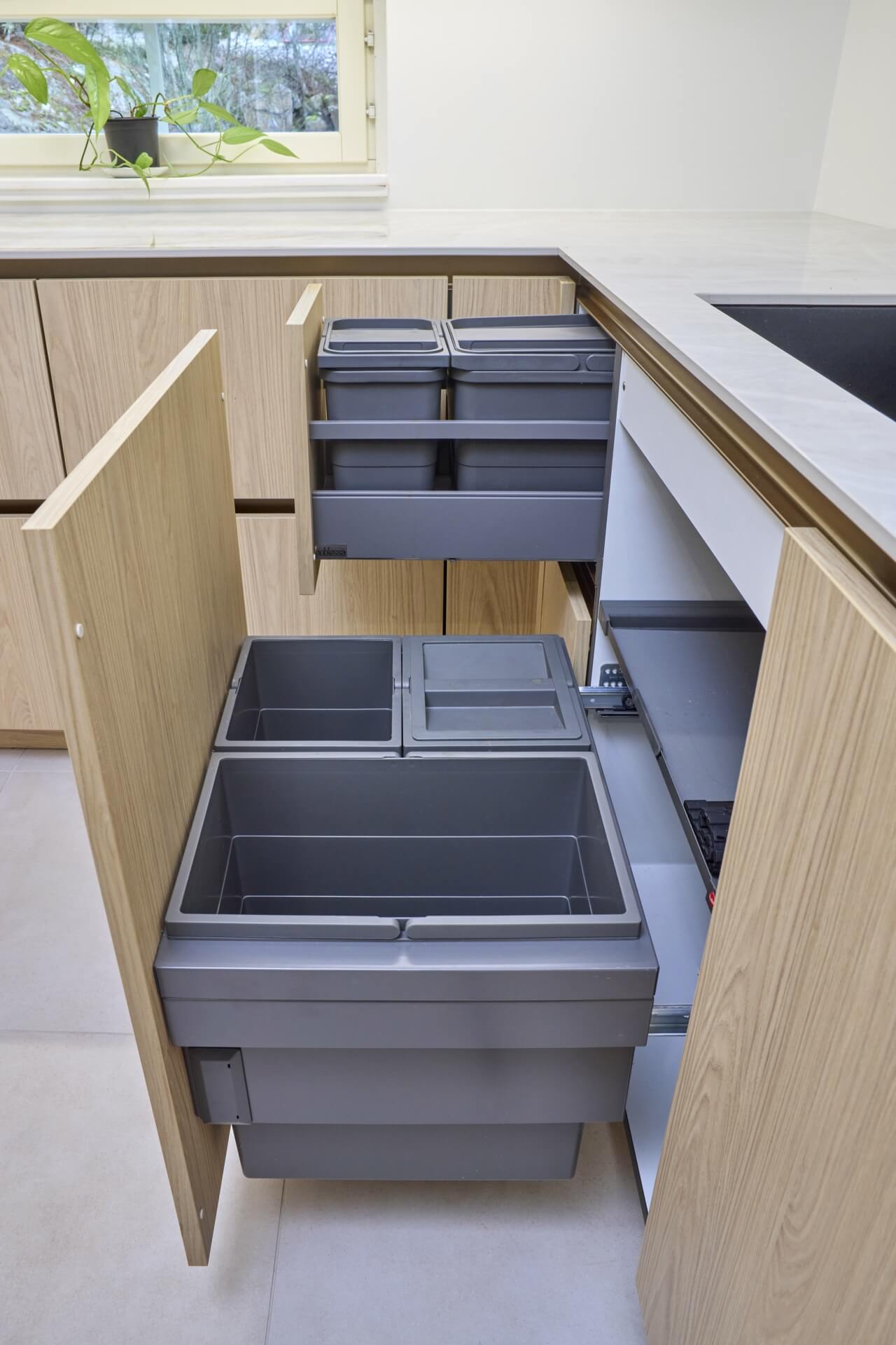 Osa keittiön toimivuutta on monipuolinen jätehuolto. Jätteiden kierrätystä varten keittiössä on jopa kuusi roska-astiaa kahdessa vierekkäisessä kaapissa. Työtason korkeudelle korotetut kierrätysastiat helpottavat siivousta ruoanlaiton lomassa, kun esimerkiksi kuorimajätteet saa vetäistyä kätevästi tasolta suoraan roska-astiaan. Sieltä biojätteet on helppo viedä pihan kompostoriin.