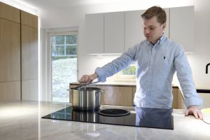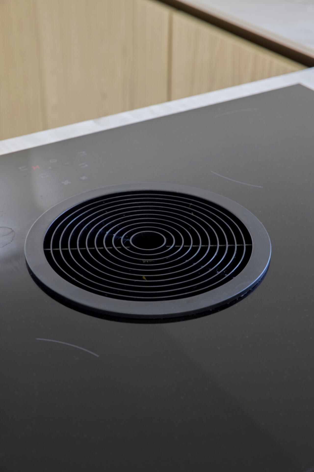 – Soiniitty ehdotti meille Boran tasoliesituuletinta, ja se kyllä täydentää keittiön kokonaisuuden täydellisesti. Kun liesi on sijoitettu niemekkeeseen, kokkaajan kasvot ovat ruokailuhuoneeseen päin, joten tässä voi samalla jutella vieraiden kanssa.