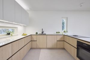 Koska keittiön yleisilme haluttiin pitää kevyenä, allasseinälle ei laitettu lainkaan yläkaappeja. U-mallisen keittiön kolmannella seinällä on välitilan ikkuna, jonka yläpuolelle sijoitettiin Noblessan valkoiset Viva-kaapit: