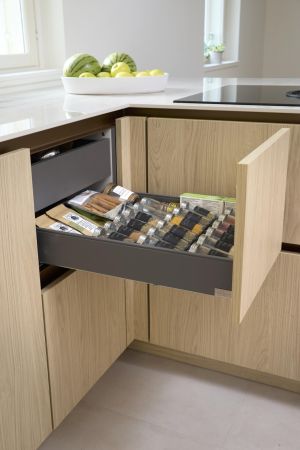 - Aamiaiskaapit. Kahden aamiaiskaapin ratkaisu mahdollisti mikroaaltouunin sijoittamisen omaan kaappiin. Kun pääaamiaiskaapin ovet avaa, sisävalaistun kaapin tumma sisus luo hienon kontrastin vaalean tammikaapiston keskelle.
