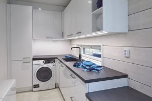 Kolmessa kylpyhuoneessa on myös Noblessan kalusteet. Niihin valittiin vaaleampia sävyjä tammikuosilla ja satiininharmailla ovilla. Kodinhoitohuoneessa on kokovalkoinen kaapisto, johon mustan betonikuosin tasot ja musta allas tuovat kontrastia. Harkittu sijoittelu ja avointen tilojen ilmavuus korostavat kalusteiden linjakkuutta. Tammento sanoo kokonaisuuden olevan niin onnistunut, että kotoa ei tee mieli lähteä enää mihinkään: