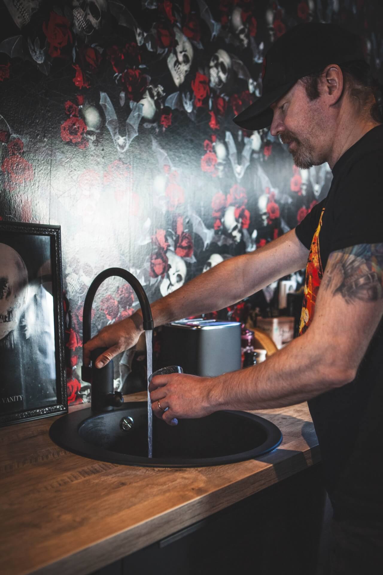 Rock-henkisessä sisustuksessa riittää vahvoja värejä, kuoseja ja tummaa estetiikkaa. Valinnat ovat Hahton vaimon hyvän värisilmän ja sisustusmaun ansiota. Ovesta sisään astuessa näyttävä pääkallotapetti tervehtii tulijaa, ja aiemmin hankittu jääkaappi-pakastin erottuu kiiltävän viininpunaisella pinnallaan kaapiston rosoisen betonikuosin keskeltä. Mustat kodinkoneet, allas ja hana luovat työtasolle yhtenäisen tyylin.