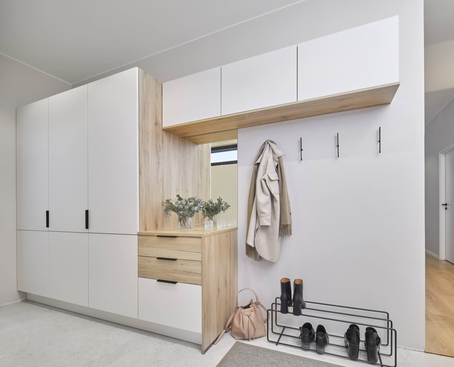 − Kaapistoihin tehtiin mahdollisimman paljon integroituja ratkaisuja, ja kodinkoneet piilotettiin kaappien sisälle. Ylimpiin kaappeihin on säilötty tavaraa, mitä tarvitaan vain kerran vuodessa tai harvemmin. Siellä on kaikkea kirjanpitoaineistosta joulukoristeisiin.