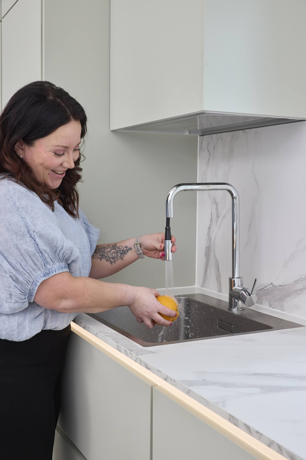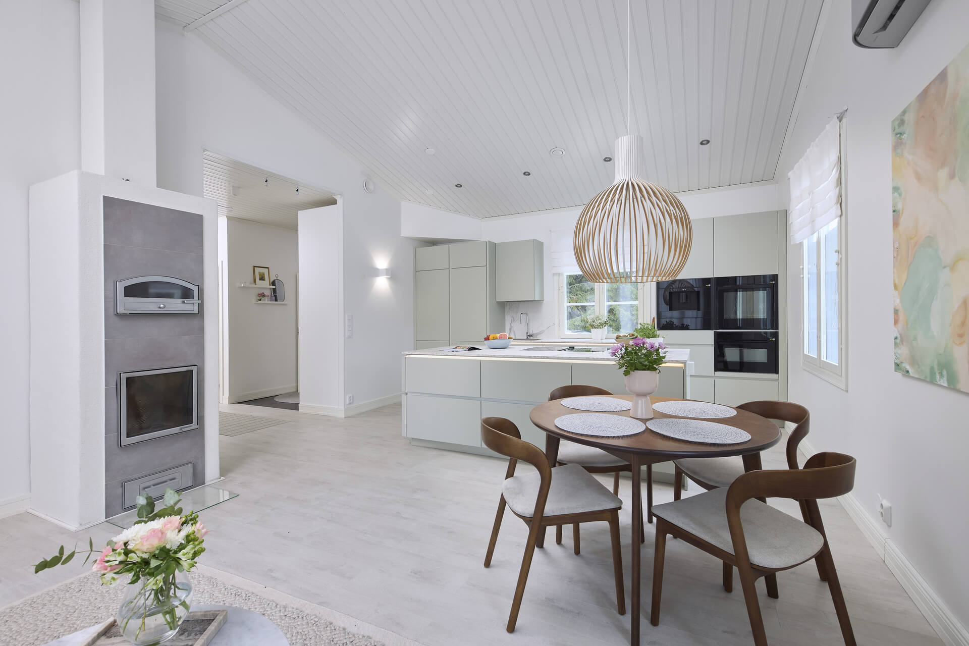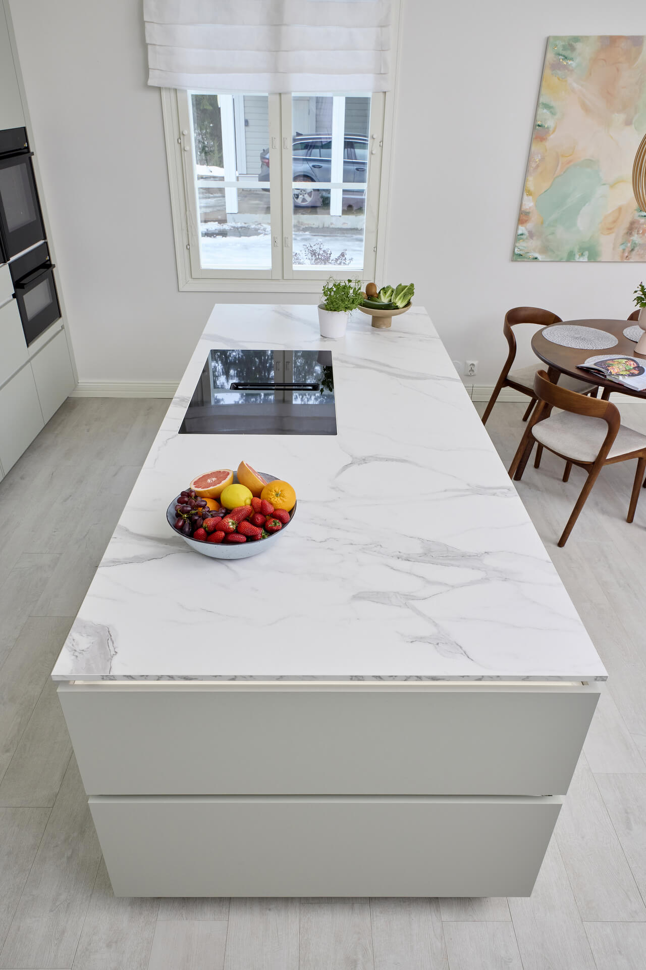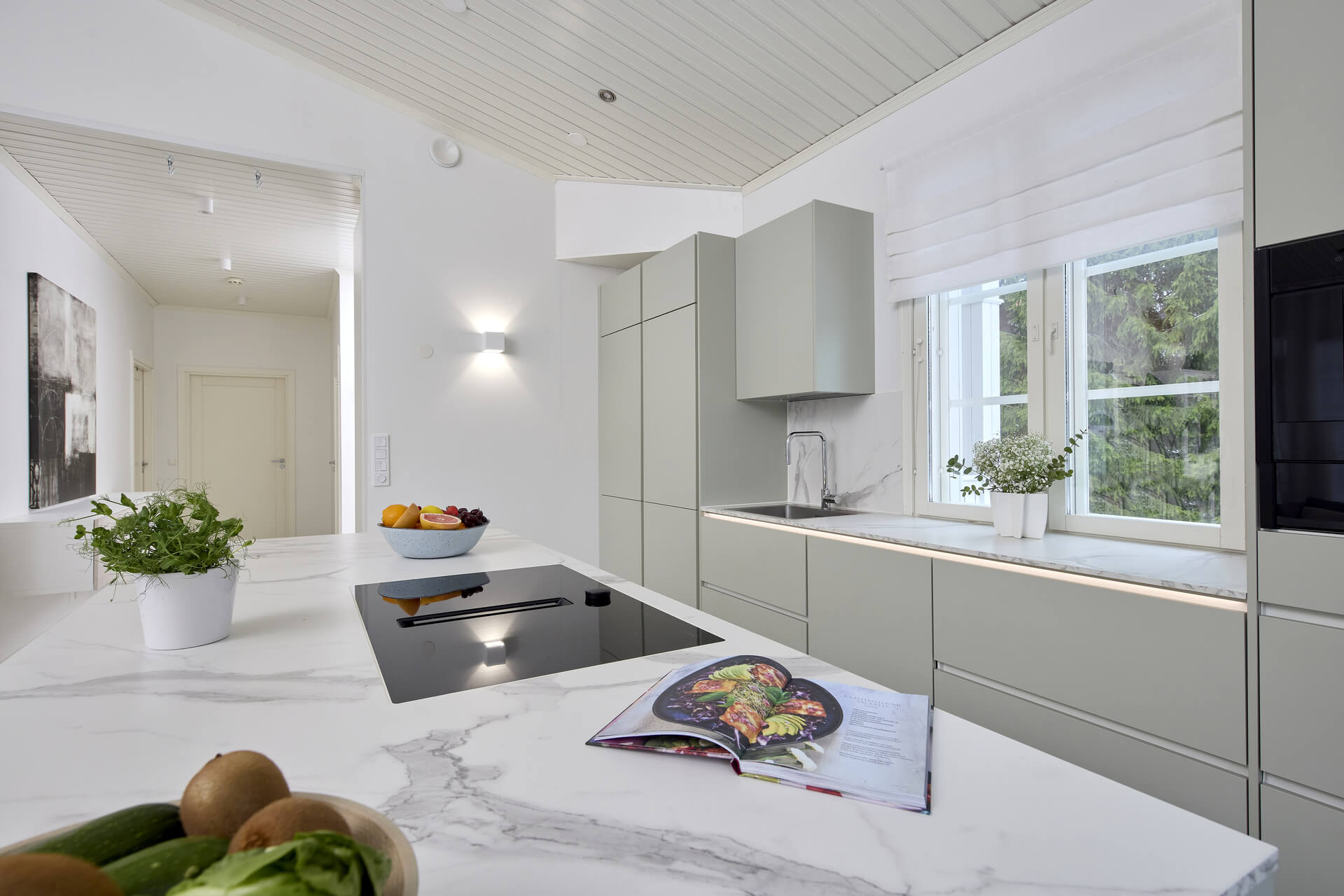 – Halusin keittiöstä kalustemaisen, niin että olohuoneen suunnasta katsoessa keittiö ei pomppaa silmille. Tasojen pitää myös olla mahdollisimman siistit, ja ylimääräisten tavaroiden kaapeissa. En halua paljon tavaroita esille, vaan pelkistetyn ilmeen keittiöön.