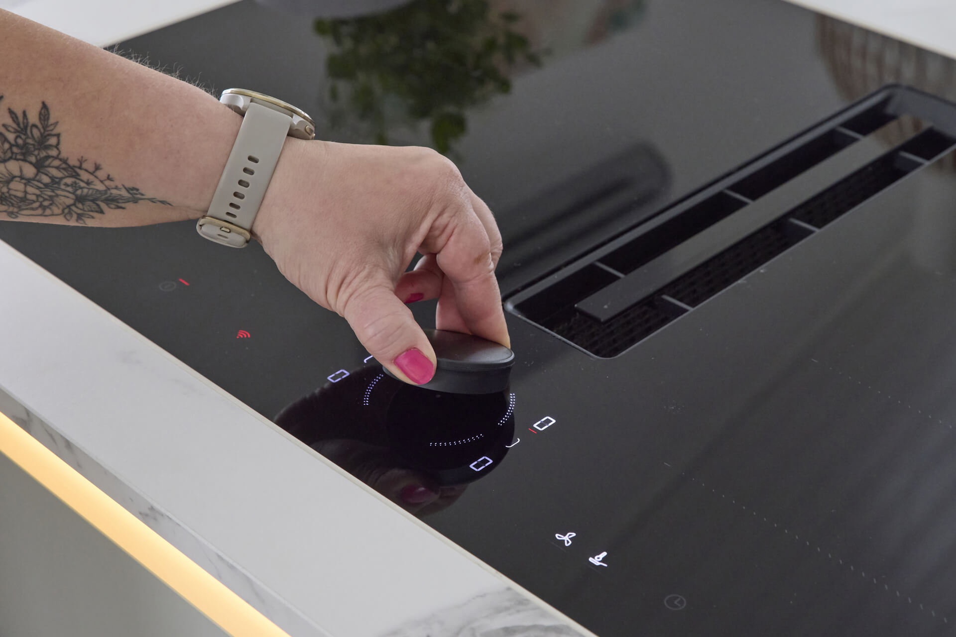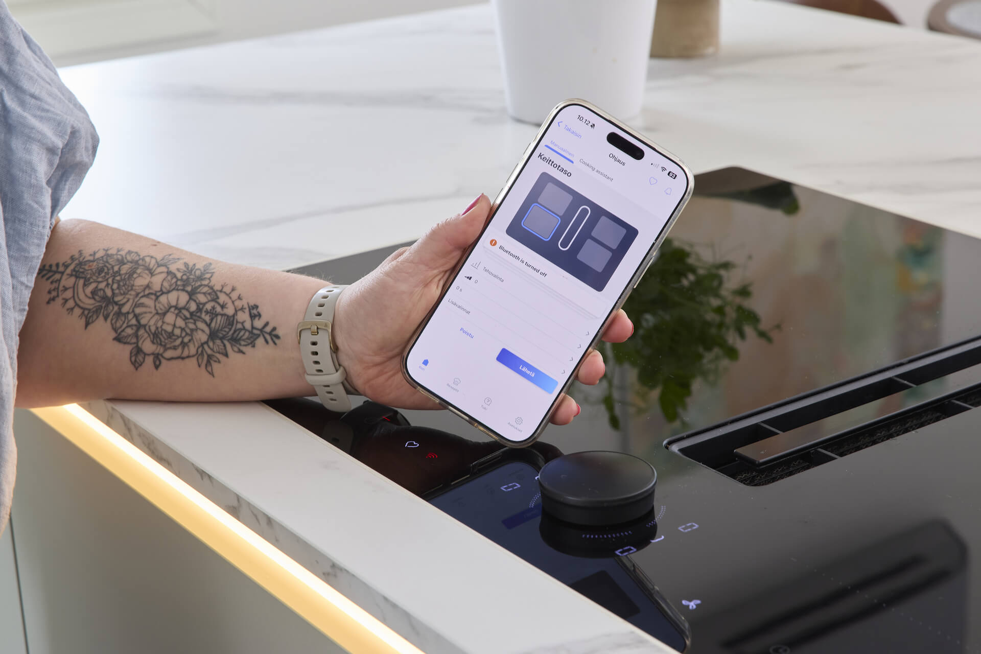 – Myönnän olleeni alkuun jopa vähän epäluuloinen tasoliesituuletinta kohtaan, mutta se on kyllä tosi tehokas. Jos paistaa vaikka pihviä, niin enää keittiössä ei tarvitse savusukeltaa, vaan sisäilma pysyy raikkaana.
