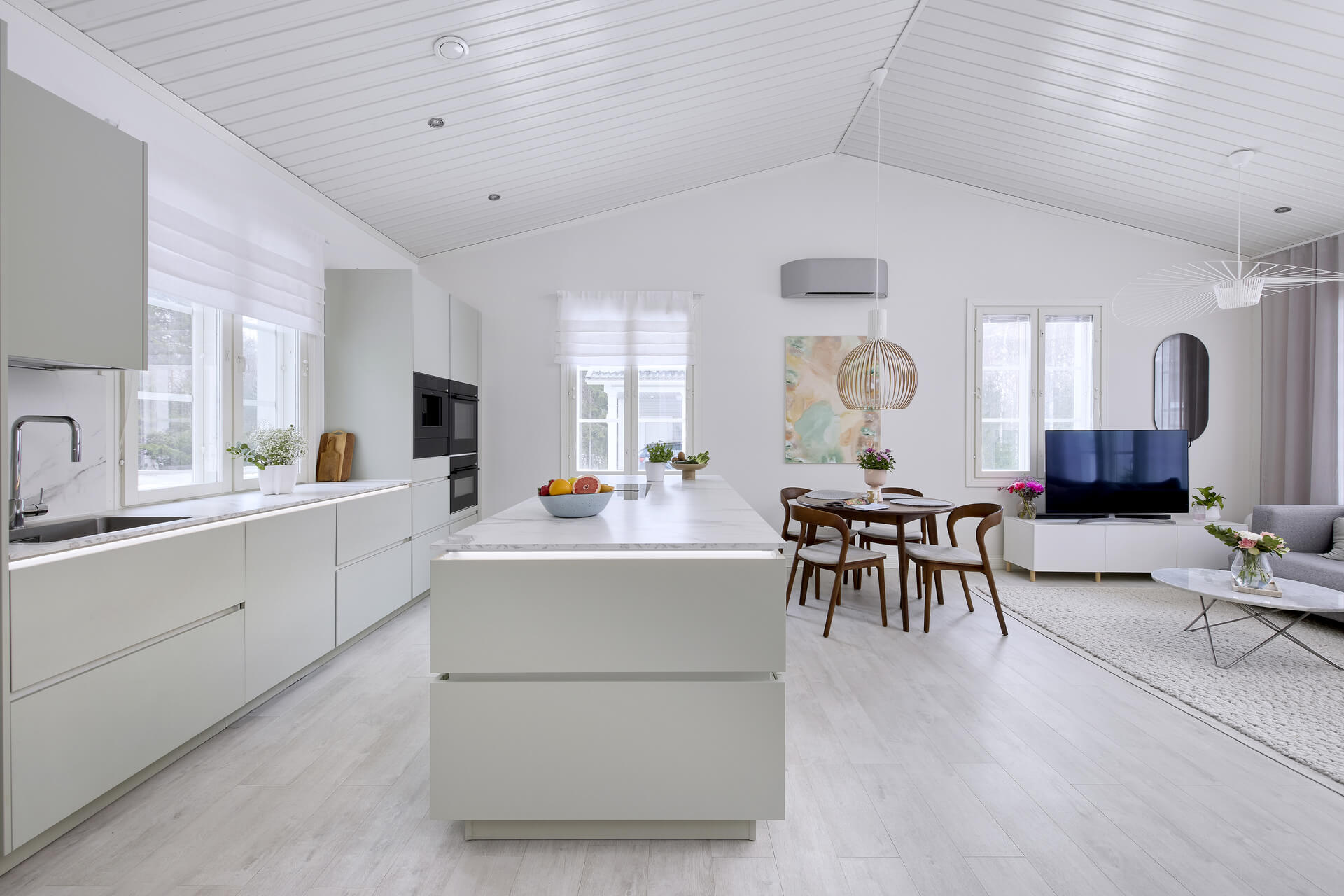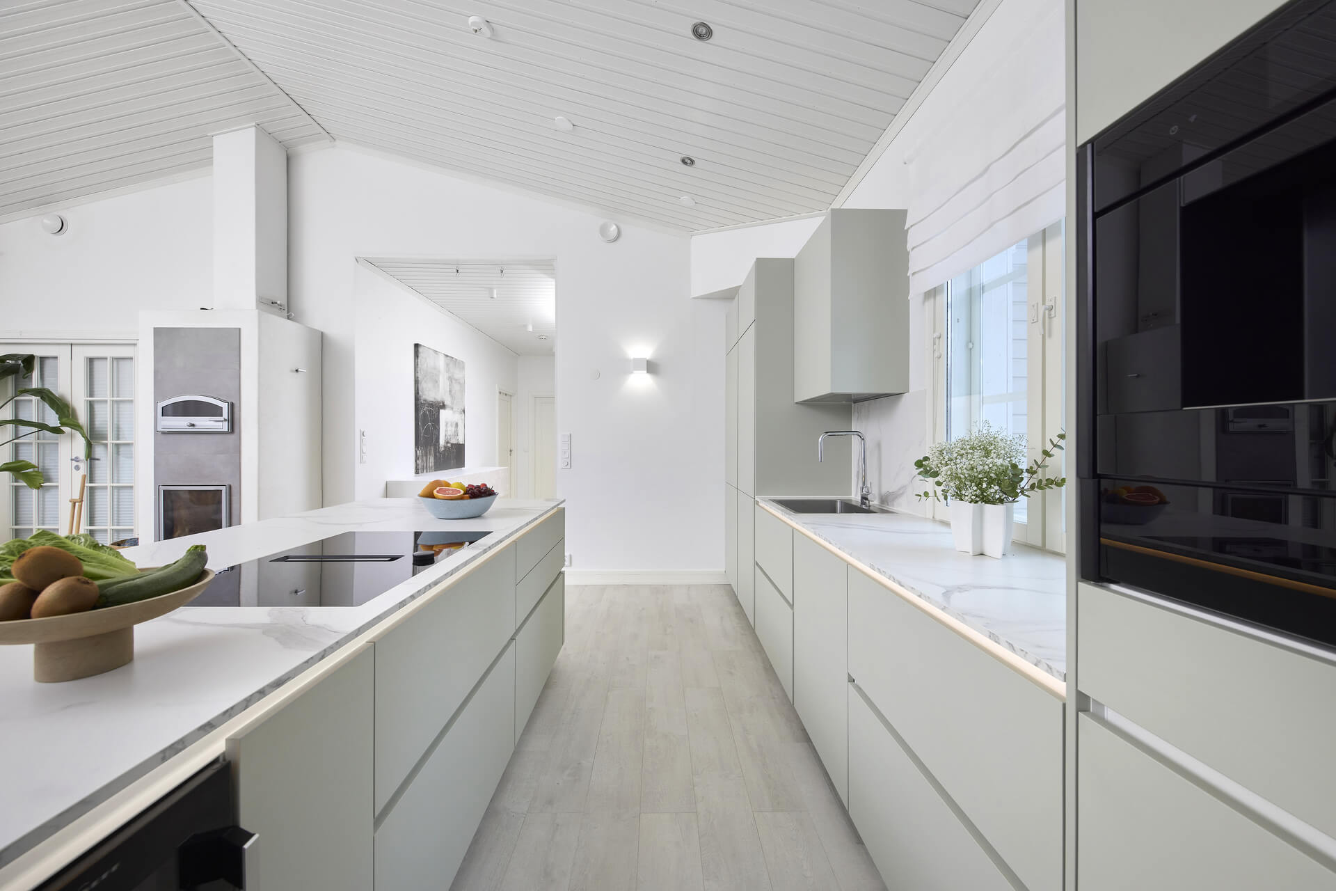 Keittiöstä haluttiin tyylikäs osa kodin muuta sisustusta, koska se sijaitsee samassa tilassa olohuoneen kanssa. Vetimetön keittiö kaapistoon integroiduilla laitteilla oli sopivan minimalistinen valinta avoimeen tilaan: