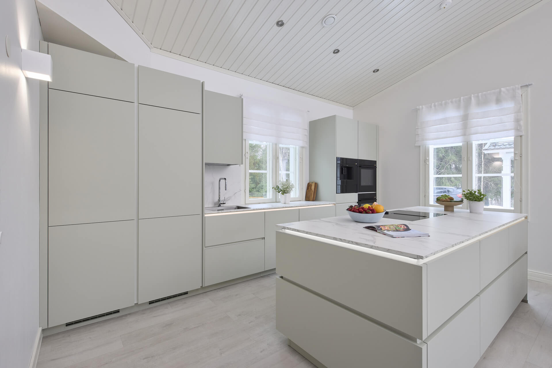 - Keittiön laadukkuus. Kaapistoon integroitu valaistus on yksi suosikkiasia. Se tuntuu jämäkältä, eikä mikään heilu. On hyvä, kun valojen kirkkautta ja sävyä voi itse säätää. Myös laatikot sulkeutuvat tosi pehmeästi, ja kokonaisuudesta tulee laadukas vaikutelma.