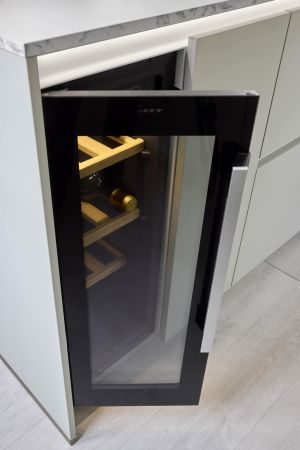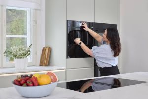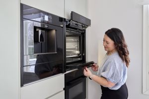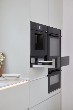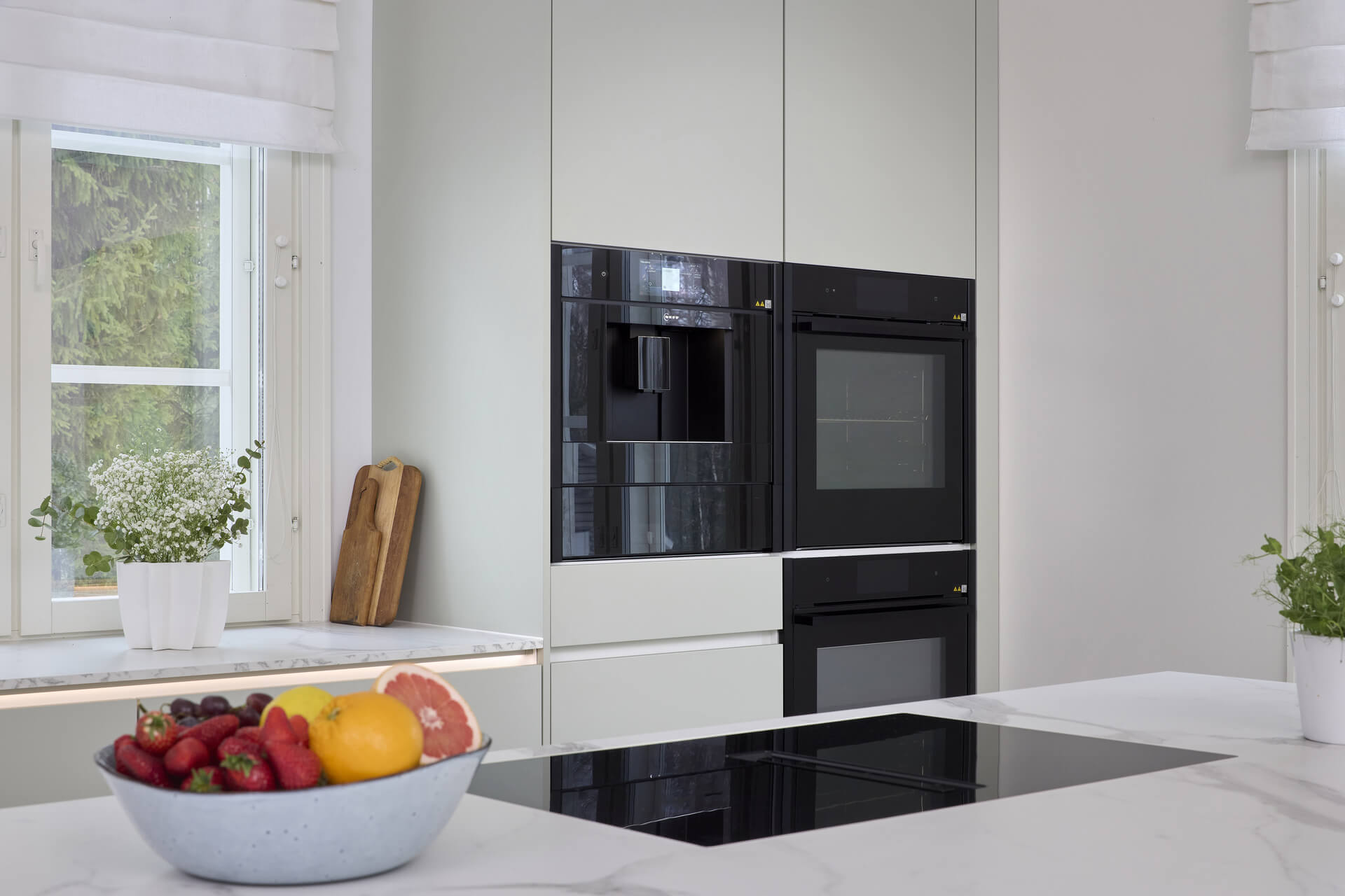 Ammattimaiseen kokkailuun tarvitaan myös ammattilaistason laitteet. Tässä keittiössä ruoanlaittoa tukevat Neffin kodinkoneet, joista etenkin höyryuuni on osoittautunut käytössä korvaamattomaksi. Keittiössä on lisäksi yhdistelmäuuni, jossa on mikro, uuni ja airfryer samassa paketissa. Höyryuunin käytössä Tiina aikoo vielä testata uunin alaosan lämpölaatikon erilaiset käyttömahdollisuudet: