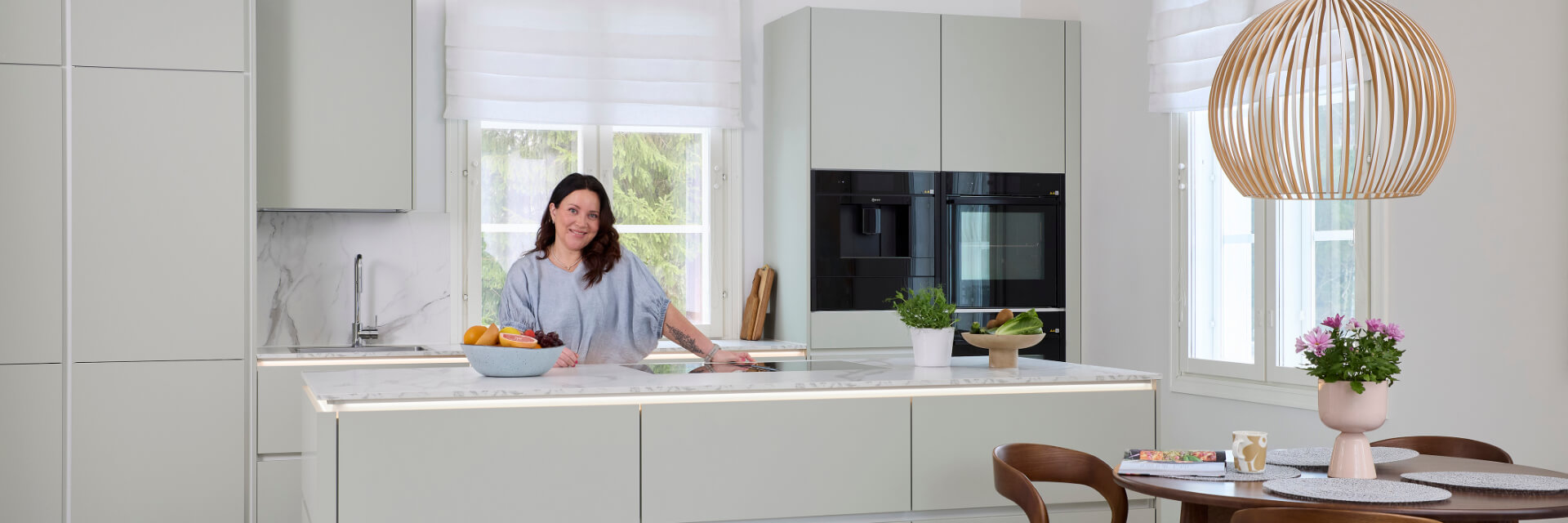 Uuden keittiön toivelistalla oli etenkin paljon erilaista säilytystilaa, koska ruokavaikuttajan työssä uusia tuotteita ja laitteita tulee testattavaksi usein, ja kaapit täyttyvät esimerkiksi blendereistä ja muista pienlaitteista. Ruokakuvauksissa myös astioita tarvitaan monessa koossa ja tyylissä, joten saarekkeen tuoma säilytys- ja tarjoilutila oli kaivattu lisä uuteen keittiöön. Noblessan Divine-malliston jadenvihreä keittiö vastasi etukäteistoiveita niin ulkonäkönsä kuin säilytystilansa osalta: