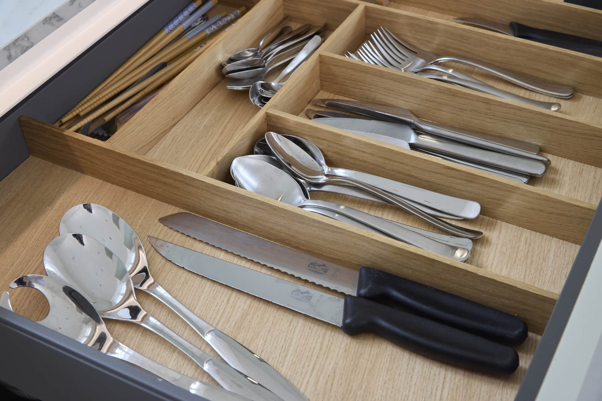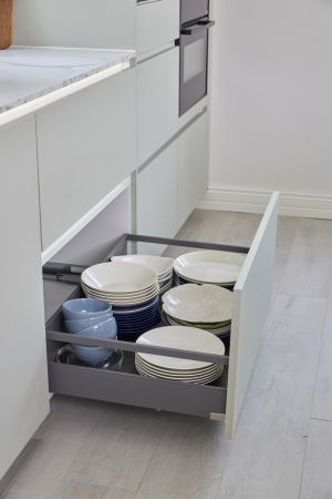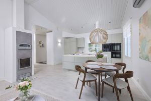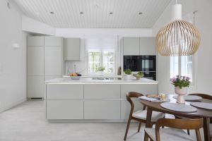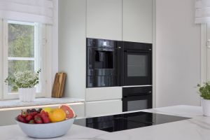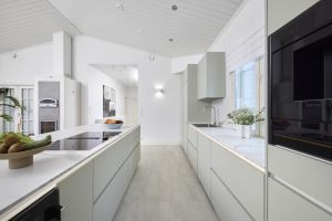 Käytännöllisessä keittiössä on huomioitu myös muu käyttömukavuus. Laitteet on asennettu juuri sille korkeudelle, missä on ergonomisinta työskennellä. Keittiön ja laitteet asensi Noblessa Jyväskylän perheyrityksen oma poika Tommi Kolari, jonka rakennusliike toimii Noblessan valtuutettuna asennustiiminä Suomessa. Asennusten nopeus oli asukkaille positiivinen yllätys: