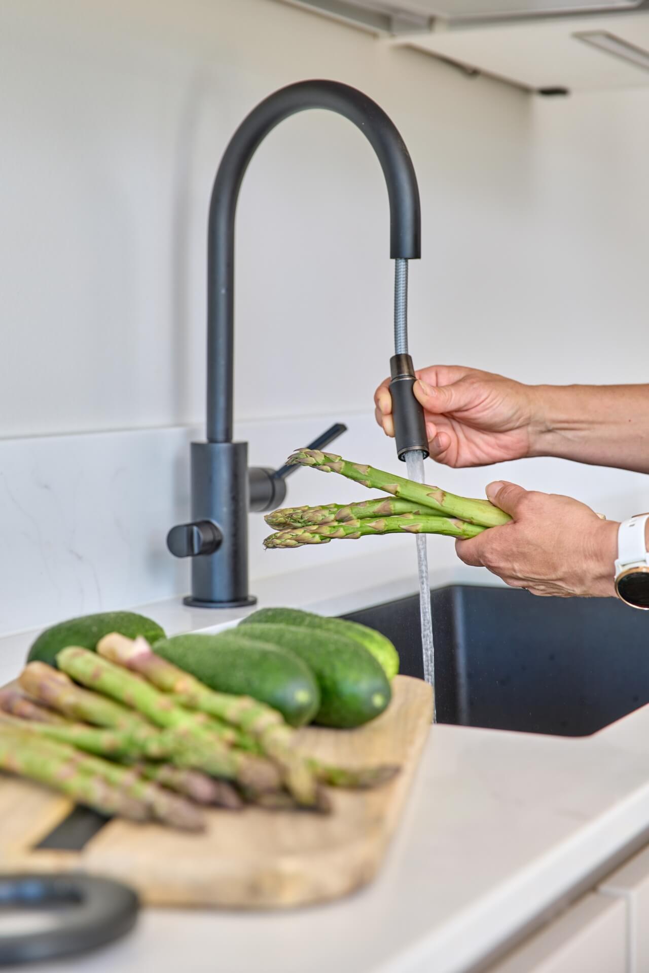 – Vanhassakin keittiössämme oli vaalea kaapisto, jossa oli anti-fingerprint -käsittely. Ovet ovat aina pysyneet siisteinä, eikä niihin ole jäänyt sormenjälkiä, joten päätimme valita saman materiaalin myös uuteen keittiöömme. Se on helppo pitää puhtaana ja kestää arkea.