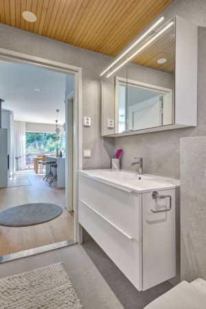 Kodinhoitohuoneessa kaapistot on valittu samaan hiekan sävyyn kuin keittiössä, mikä tuo tiloihin harmonisen tunnelman. Eteiseen, makuuhuoneisiin ja wc-tiloihin tuli Noblessan Divine-malliston mattavalkoiset kaapistot, jotka sulautuvat kauniisti tilojen muuhun sisustukseen.