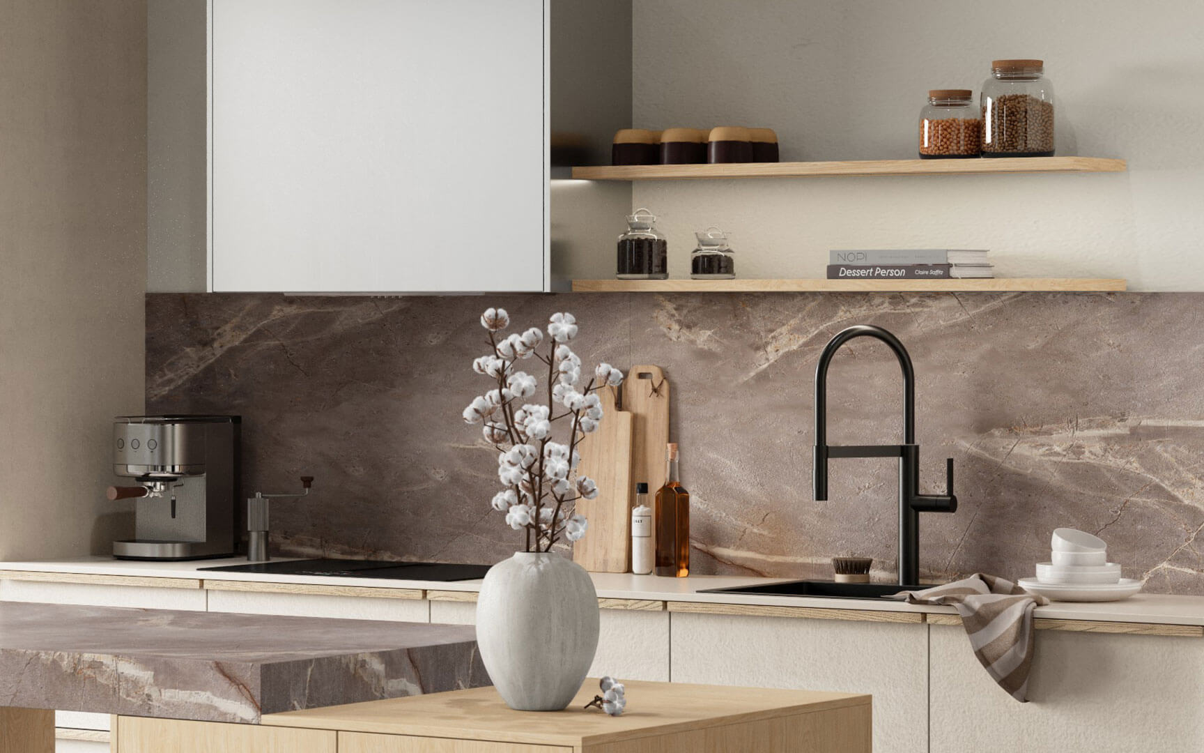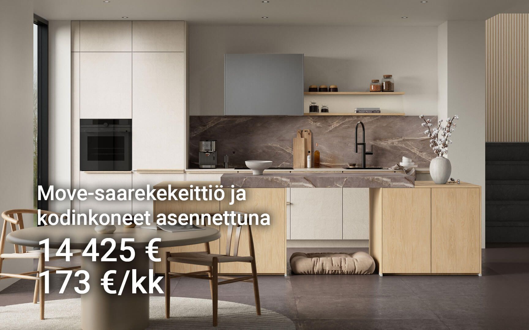 Toinen keittiö on samaa teksturoitua hiekkakuosia, mutta tässä keittiössä on näyttävä saareke, jonka alle voi sijoittaa vaikkapa lemmikin pedin tai baarijakkarat. Harmaa Mystic-marmorikuosi luo upean kuvioinnin keittiön välitilapaneeliin ja saarekkeen paksuun konsolitasoon. Sirot puuvetimet sopivat kauniisti yhteen saarekkeen Como-tammikuosin kanssa. Move-saarekekeittiö kodinkoneineen, toimitus kotiin kannettuna ja asennus yhteensä 14 425 € tai 173 €/kk.