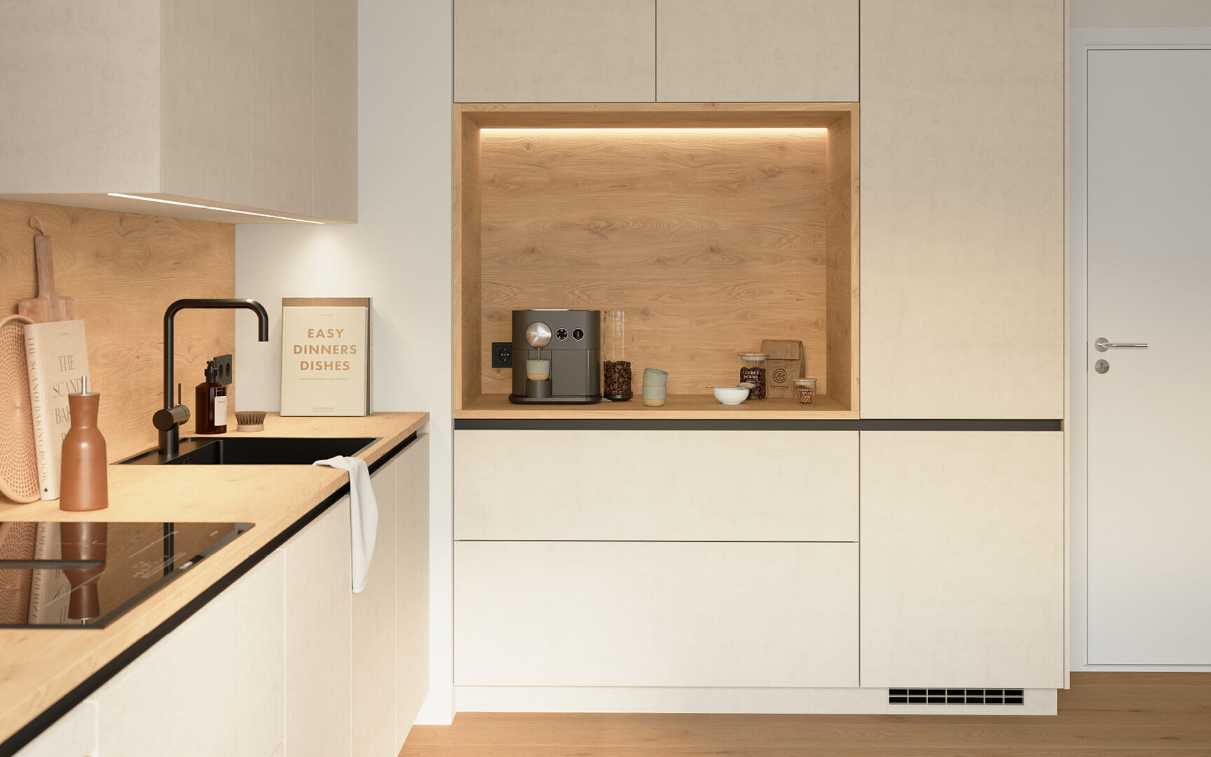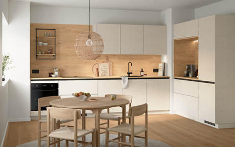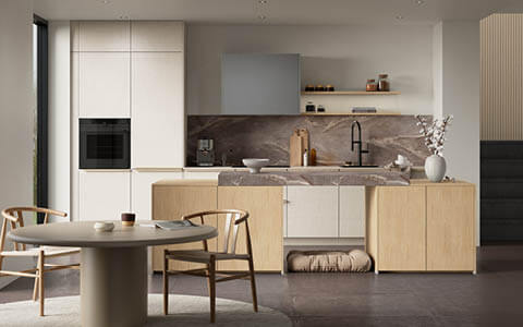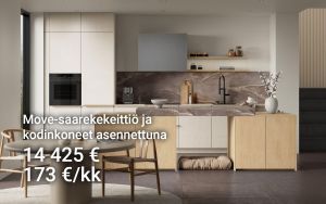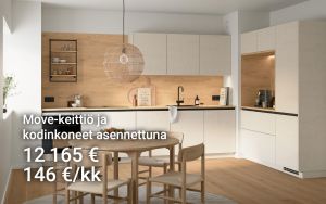 L-mallisessa keittiössä on Move-ovimalli teksturoidulla hiekkakuosilla sekä aamiaissyvennys Como-tammikuosilla. Move-ovien hienovarainen pintarakenne tuo tyylikästä eloa keittiön sisustukseen, ja vaalea värimaailma yhdistettynä työtasojen ja taustapaneelin tammikuosiin tekee kokonaisuudesta harmonisen. Vetimettömän Line N -kaapiston mustat vedinurat luovat keittiöön tyylikkäitä vaakalinjoja. Kätevä aamiaissyvennys integroidulla valaistuksella luo aamuihin todellisen kohokohdan! Move-kulmakeittiö kodinkoneineen, toimitus kotiin kannettuna ja asennus yhteensä 12 165 € tai rahoituksella 146 €/kk.
