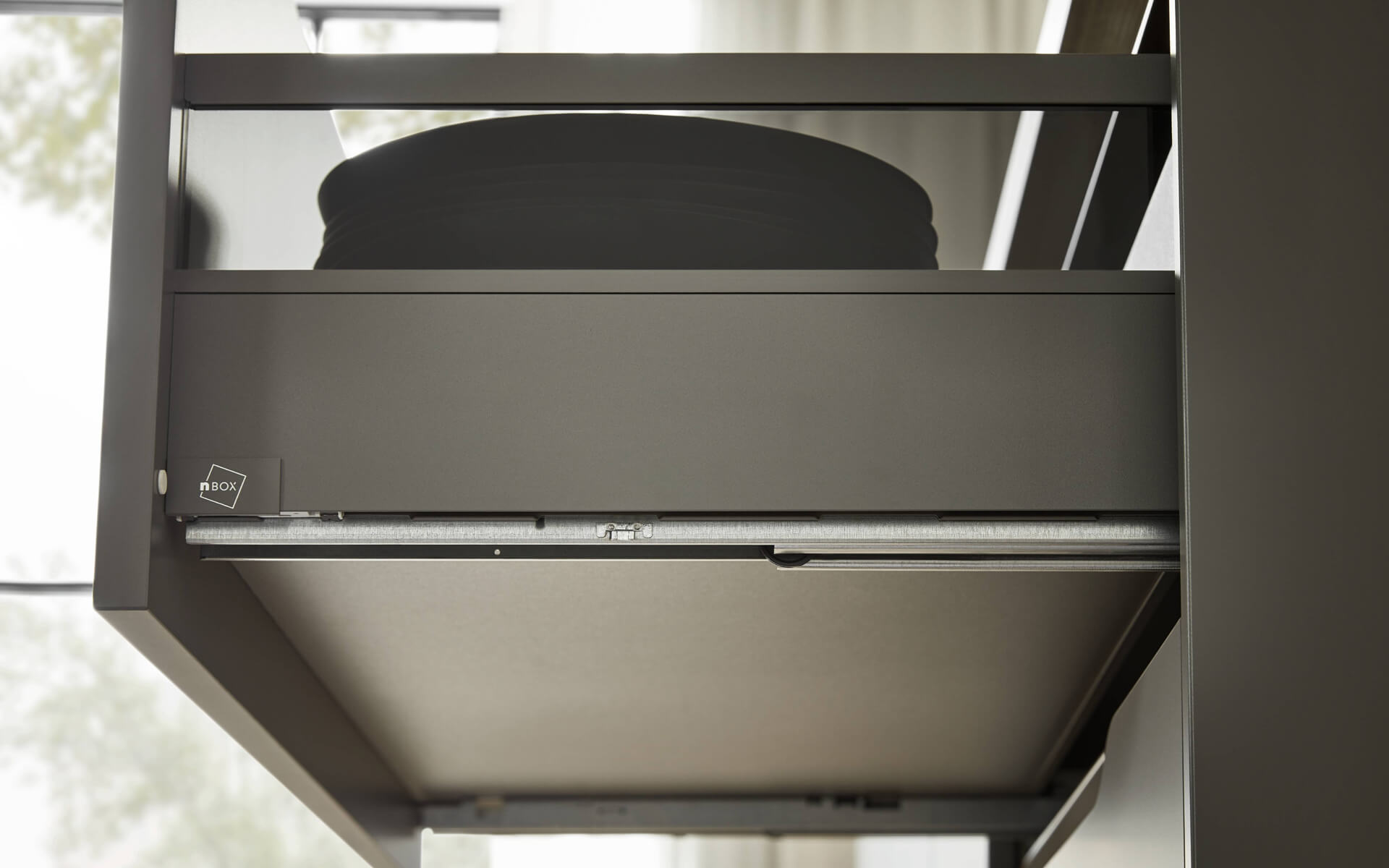 Enemmän säilytystilaa. nBOX-laatikkojärjestelmän toimintojen monipuolisuus ja innovatiivinen tekniikka on viimeistelty pienintä yksityiskohtaa myöten. Laatikko hyödyntää käytettävissä olevan kaappitilan kokonaisvaltaisesti kapean rungon ja laatikon alle sijoitetun ohjainkiskon ansiosta.