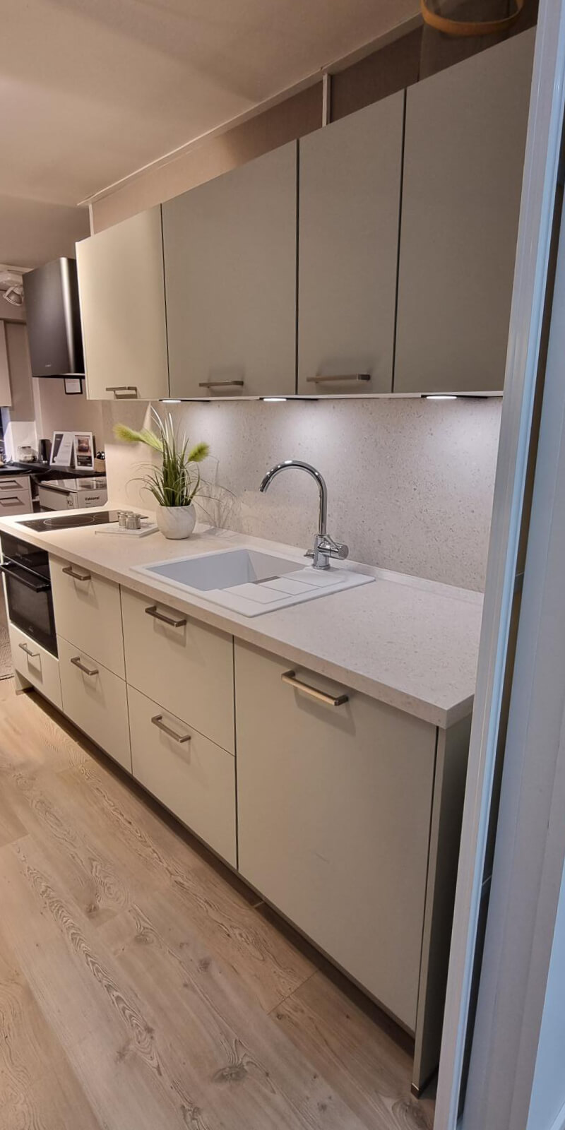 - led-profiili LNDERB kaappien alla ja upotettu Nova Plus -valo lasikaappien sisällä