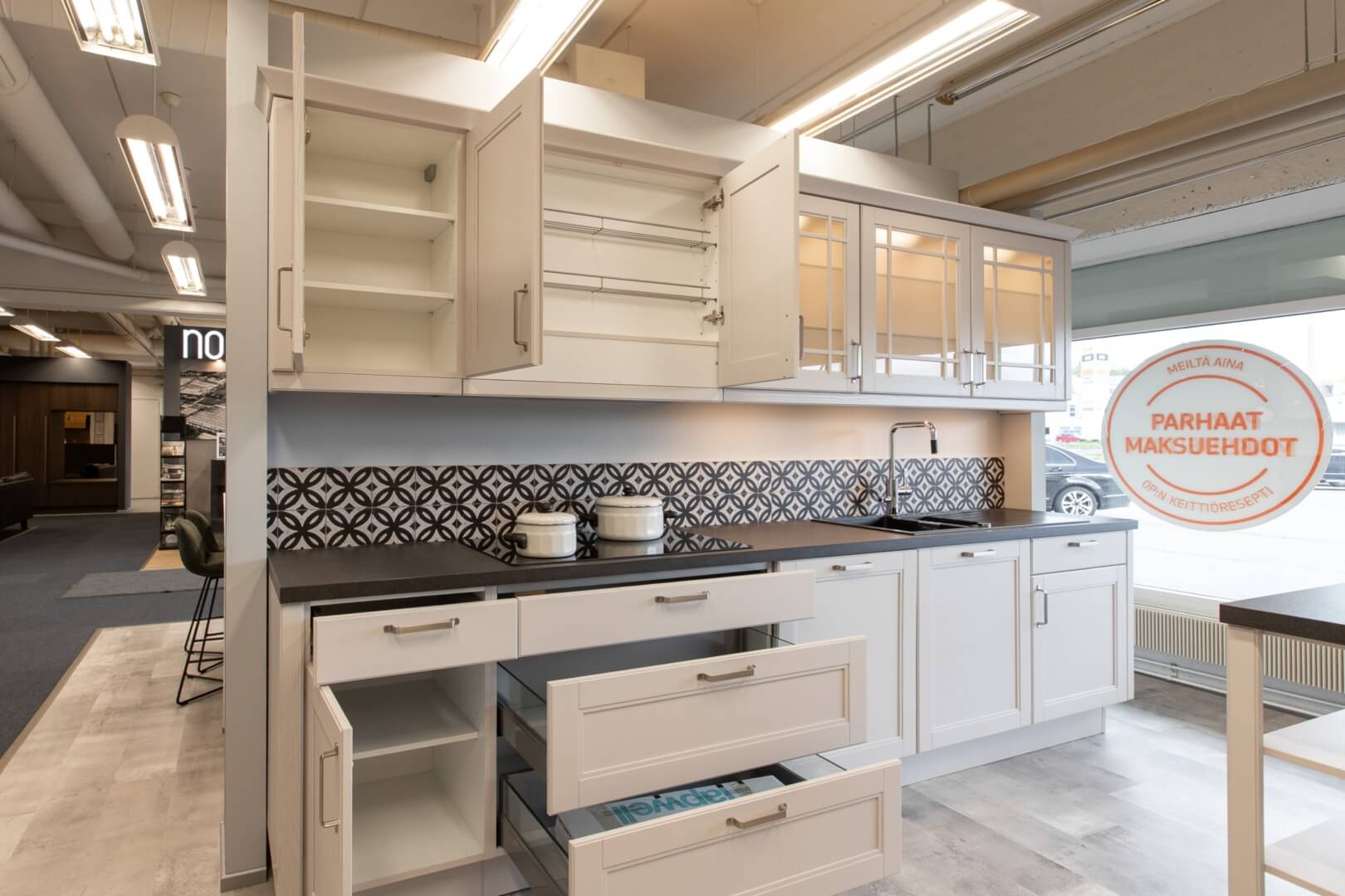 Noin 500 neliön kokoisessa myymälässä Tampereen Lielahdessa on kattavasti esillä erilaisia keittiöitä sekä kodin säilytysratkaisuja. Noblessalta löytyy kalusteita myös kylpy- ja kodinhoitohuoneeseen, olohuoneeseen, eteiseen ja työhuoneeseen.