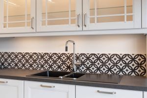 - allas: musta 2-altainen allas ("SCHOCK: Built-in sink Patos D-150, made of CRISTADUR, magma")